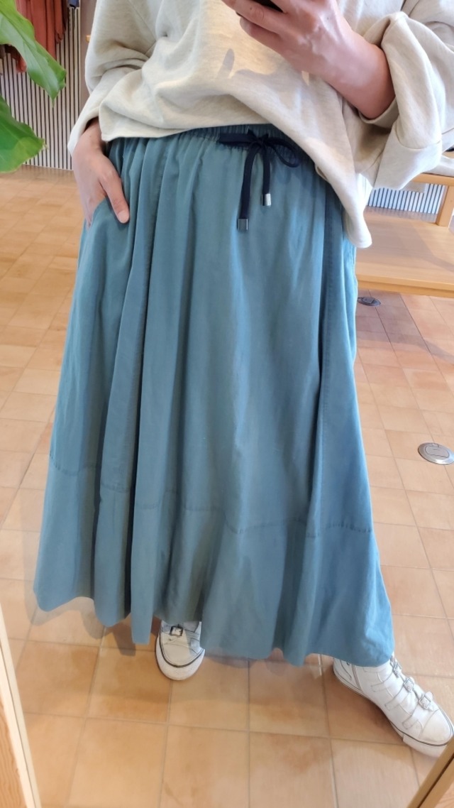 裾に向かってほのかにふんわりとしたシルエットで楽しむロング丈ギャザースカートです。 ウエストは総ゴムのイージーな仕様で穿き心地楽々◎ ハギのフレアの落ち感に、膝下から切り替えた部分は裏地をクシュっと繋げてボリューム感のある裾を作り、印象的なスカートスタイルを演出してくれます。 お色はインディゴ染めでナチュラルな風合いに仕上げた[ブルーグリーン]。 柔らかく馴染み、デニムのような感覚でお洒落に軽~くコーディネートできるおすすめのスカートです☆ ■¥18,800 → ¥13,160+税 [フルーグリーン系] 本体:コットン100% 裏地:コットン100% ** ご家庭で手洗いできます ** 40size 《ウエスト70~102㎝ ヒップ137㎝ 総丈92㎝》