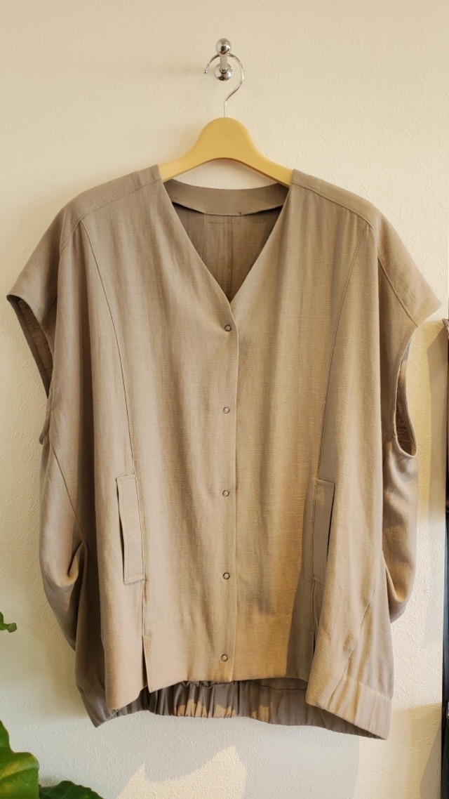 さらりとした麻混の素材の<アヤン>フレンチスリーブジャケットです★ ゆったりとリラックスに羽織れるシルエットで体型をカバーしてくれて、ノースリーブやTシャツ、ワンピースなど、プラスワンでひとつ何か羽織りたい!という方へおススメのジャケットです。<アヤン>らしいクシュっと丸く可愛い後ろ姿もポイントです! さらっとナチュラルな風合いの麻混素材でとっても涼しく着ていただけます。 同素材のサロペットと合わせたコンビスタイリングもオシャレ度高めコーデでおすすめです^^ ◆¥15,800 → ¥12,640+税 【グレー】 レーヨン56% ポリエステル35% 麻9% **ご家庭で手洗いできます** 38フリー サイズ 《バスト13 5㎝ 着丈77㎝ 裄丈35㎝》