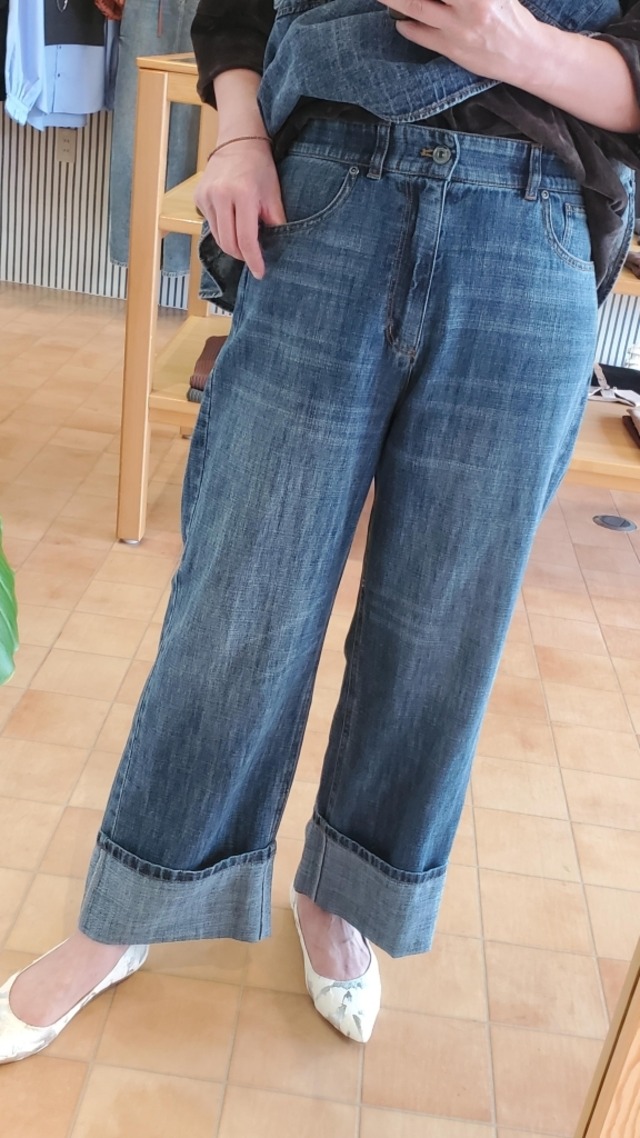 裾の折り返しがポイントの<ayane> リネン混デニムワイドパンツ☆ リネン混の生地を使用し、さらさらとした爽やかな肌触りが特徴。しっかりとした質感のデニムながらも柔らかい穿き心地で残暑の時期から秋本番まで快適にご着用いただける嬉しい素材です。 軽やかな裾の折り返しがアクセントとなり、シンプルながらもおしゃれな印象を与えてくれるデニムパンツです!どんなトップスとも合わせやすく着回し力も抜群。 同素材ビスチェとの新鮮なセットアップコーディネートが一番のおすすめです♪ ◆¥17,800 +税 【ブルーデニム】 麻55% コットン45% **ご家庭で手洗いできます** ・38サイズ 《ウエスト71~81㎝ ヒップ100㎝ 総丈103㎝ 》 ・40サイズ 《ウエスト74~84㎝ ヒップ103㎝ 総丈103㎝》 ・42サイズ 《ウエスト77~87㎝ ヒップ106㎝ 総丈103㎝》