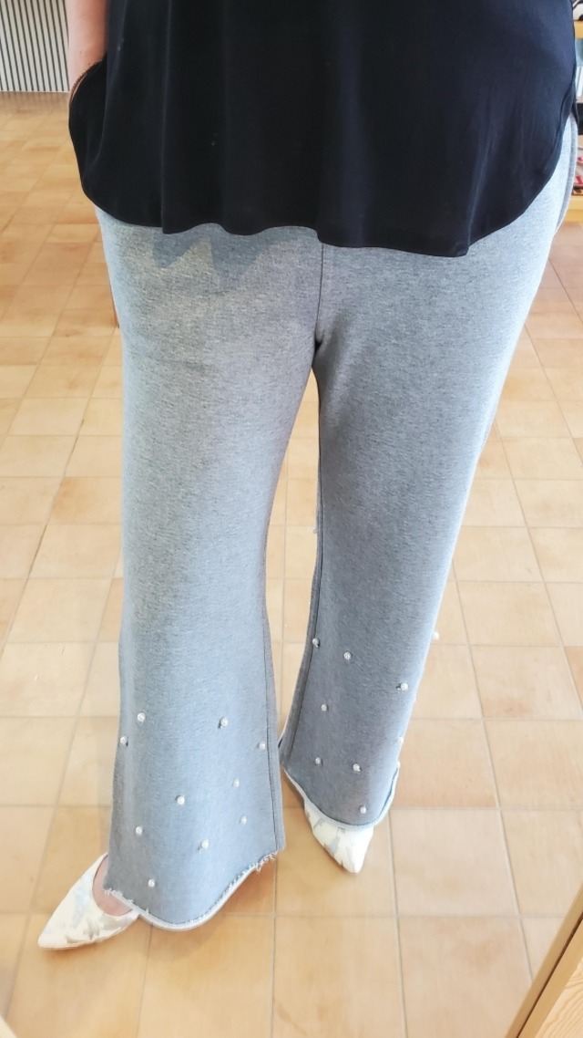 スウェットパンツの裾にパール&ビジューをあしらった斬新なデザインのリラックスパンツ☆ さらっとした裏毛の素材で、ノンストレスな穿き心地になっています。 パールは裏で金具留めしていますので扱いも安心です◎ シルエットはすっきりとしたフレアと切りっぱなしの裾で綺麗めに。 今年人気のスウェットパンツコーディネートをラフ過ぎず綺麗めな印象で挑戦したい!という方へおススメのパンツです☆彡 ◆¥19,000+税 【グレー】 綿100% ** ご家庭で手洗いできます ** フリーサイズ 《ウエスト70㎝~ ヒップ96㎝ 総丈97㎝ 股下68.5㎝》
