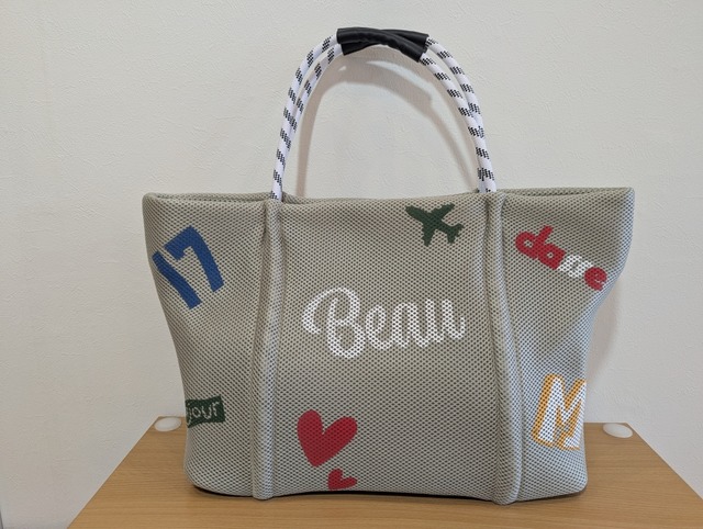 ポップなプリントとウレタンメッシュ素材が夏らしい【MARIED'OR】トートバックです。 もちっとした手触りの柔らかなウレタンメッシュ生地はとても軽量で、気軽にデイリー使いにもぴったり! 内側にはしっかり裏地貼りがされていますので、お荷物が多い日でもダレたり変形する心配なくお使いいただけ、内側にはファスナー付きのポケットが。持ち手には合皮を巻いて高級感を持たせてくれています。 軽くてたっぷりの容量バックは夏のお出掛けや通勤にも重宝しそうですね♪ ¥13,500 → ¥10,800+税 【グレー】お写真右側 【チャコール】お写真左側 本体素材:ポリエステル100% 裏地素材:ポリエステル100% 持ち手:ポリエステル100%+合成皮革 サイズ:縦30×横底39(横上51)×マチ14㎝