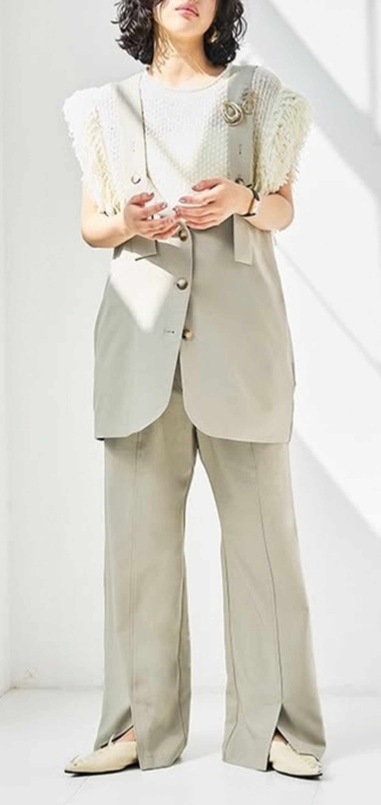 同素材のチュニックベストと合わせたワンランク上のセットアップスタイリングがおすすめです!