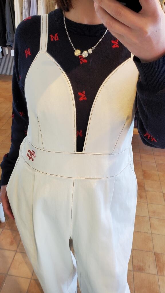 張りのあるコットン100%ホワイトデニムにキャメルのステッチや赤いブランドロゴ刺繍がアクセントになり、他には無いオーバーオールに仕上がっています☆