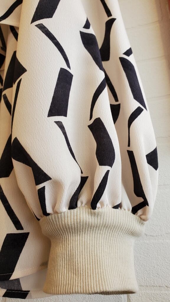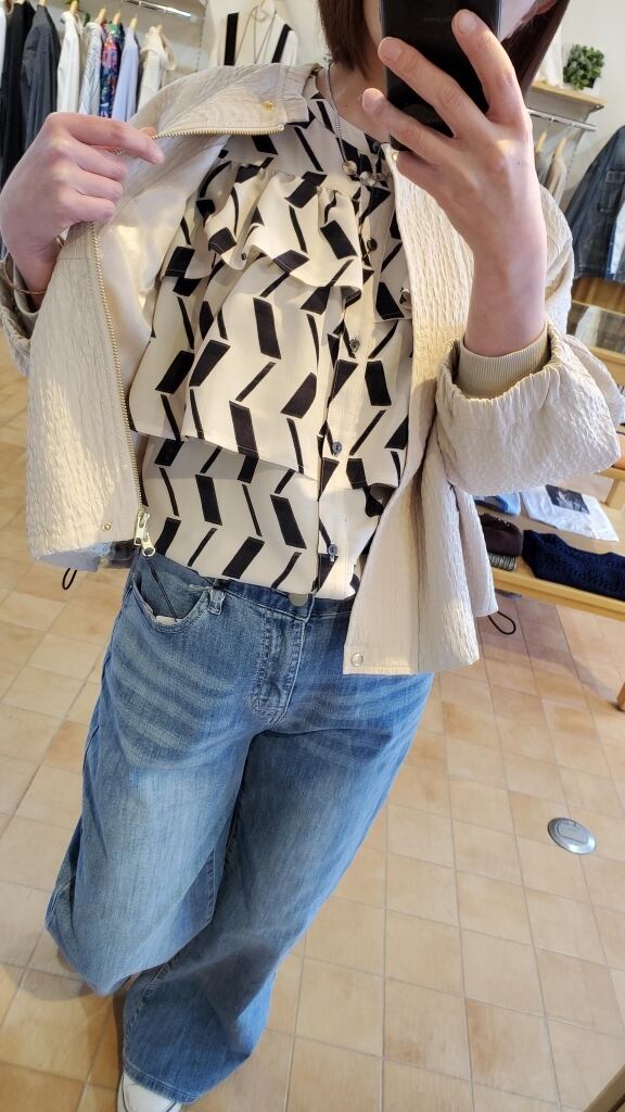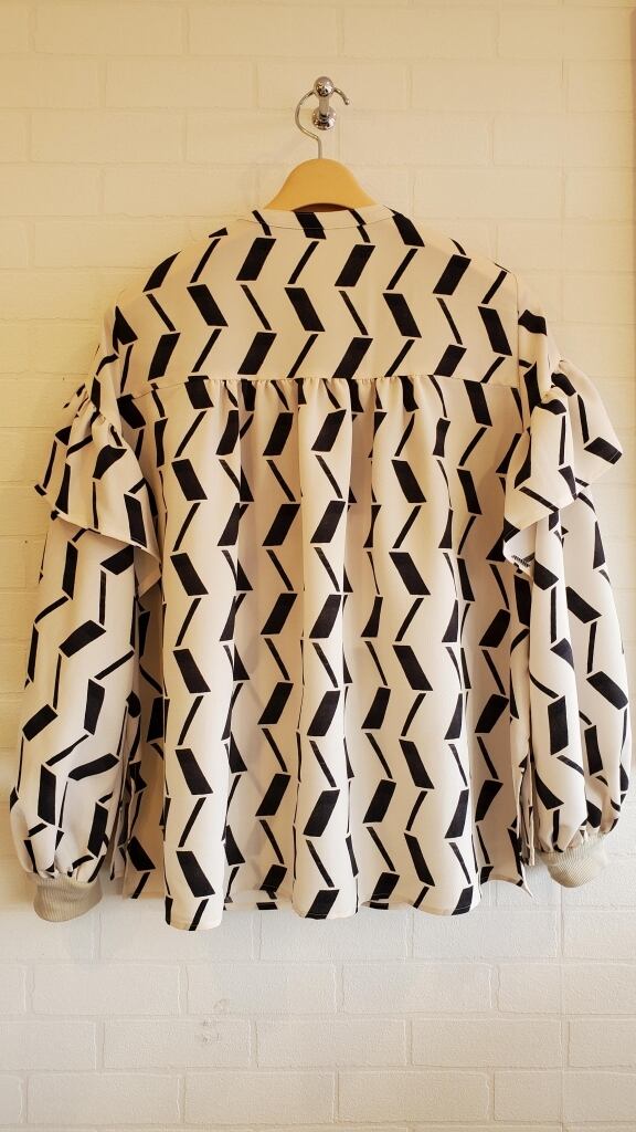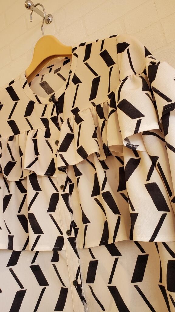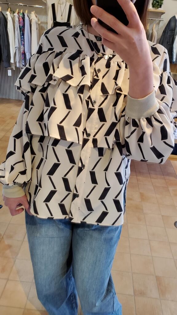 大胆な幾何学模様を全体にあしらったフリルブラウスです。