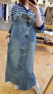 華奢な肩ストラップで女性らしく。デニムパンツのようなお洒落な胸当てでデザイン性のあるジャンスカになっています。