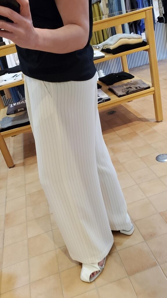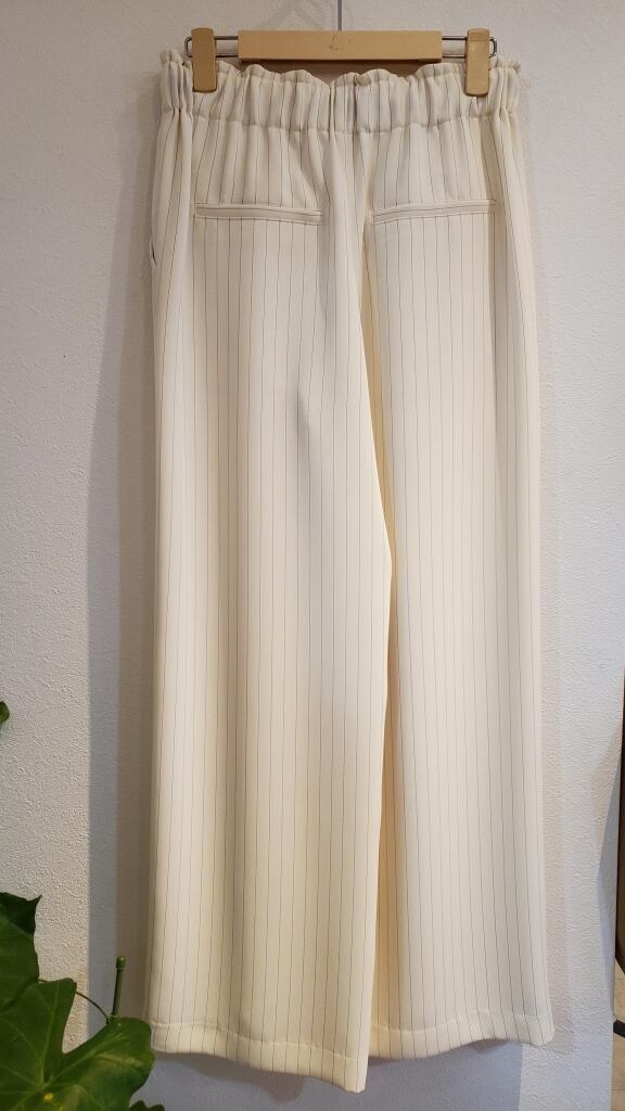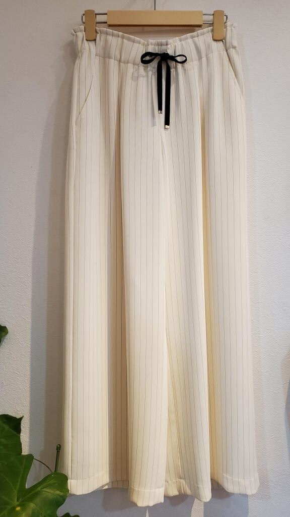 品の良いストライプ柄ダブルクロス素材のワイドパンツです。