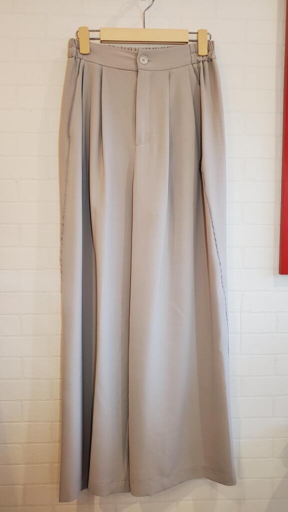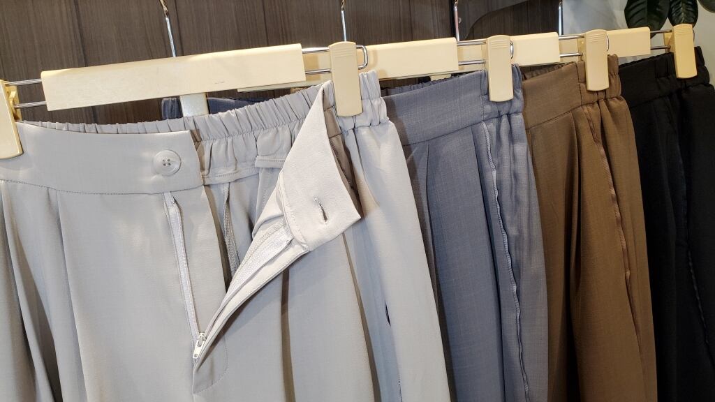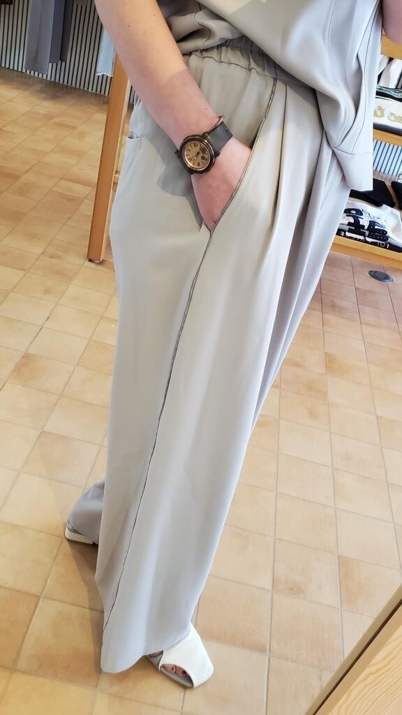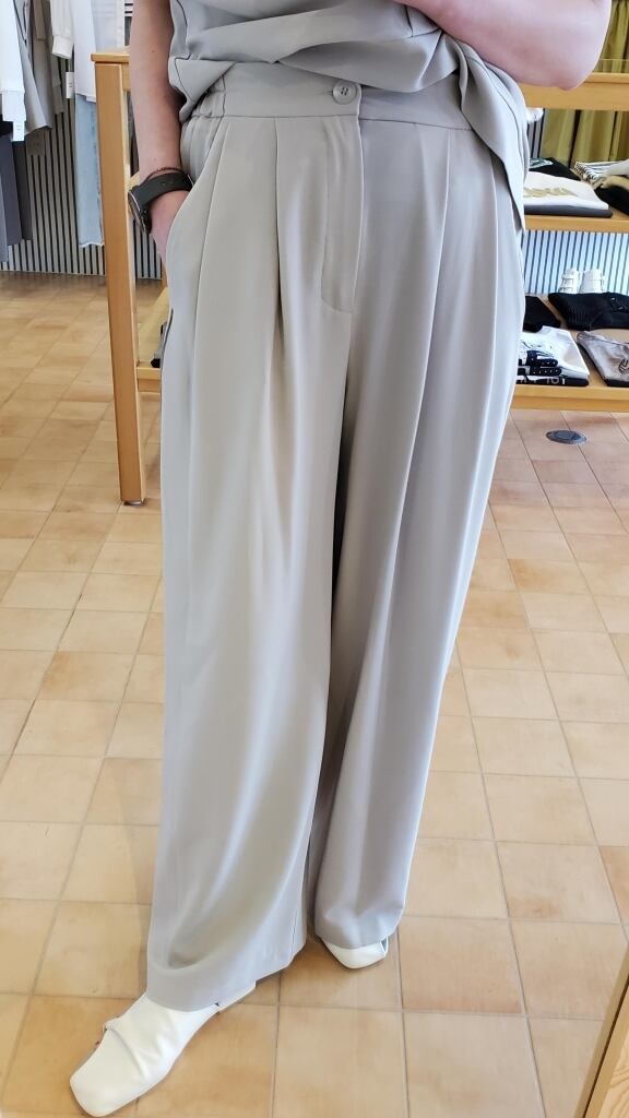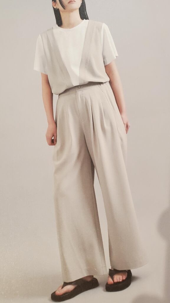 さらさらドライタッチで落ち感のある生地にタックの縦ライン効果も効き、すらり美脚のシルエットが叶います。