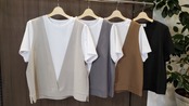 シンプルなTシャツに深いVネックを重ねたような、胸元をスッキリ見せしてくれるデザイン。