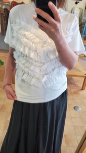 つるんと心地よいシルケットコットンのTシャツに、張りのある布帛とチュールでフリルをあしらったデザイン。一枚着るだけで見映え感たっぷりなトップスに仕上がっています。
