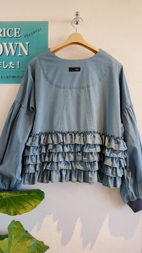 インディゴ染で柔らかくこなれた風合いが、裾にたっぷりとあしらったフリル使いやふっくらスリーブも甘く見せずに大人可愛く仕上げてくれます。