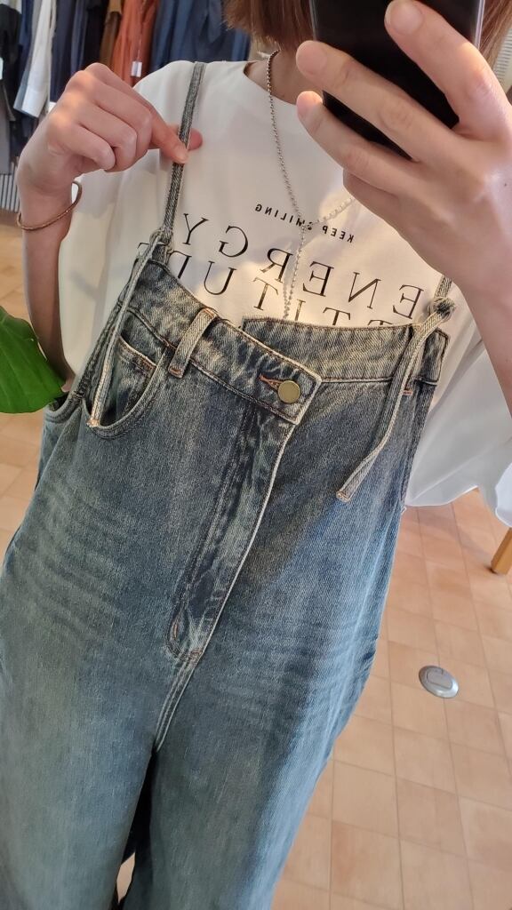 アシメトリーな胸当てと華奢なお紐が大人のカジュアルを作ってくれる、お洒落デニムサロペットです★