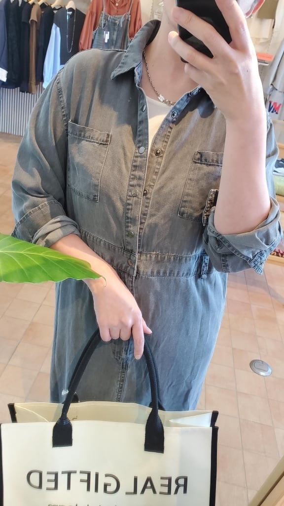 膨らまず、程よい身幅のすらりⅠラインシルエットも、大人が楽しめるデニムワンピースとしておすすめポイント◎です。着丈は128㎝と少し長め設定ですが、サンダルもショートブーツにも合わせやすい丈ですよ。胸元、お袖はボタンで開け閉め楽々。ヴィンテージなブラックもこなれた感がありで抜け感ある大人スタイルになります。