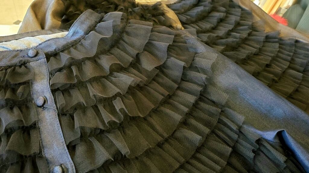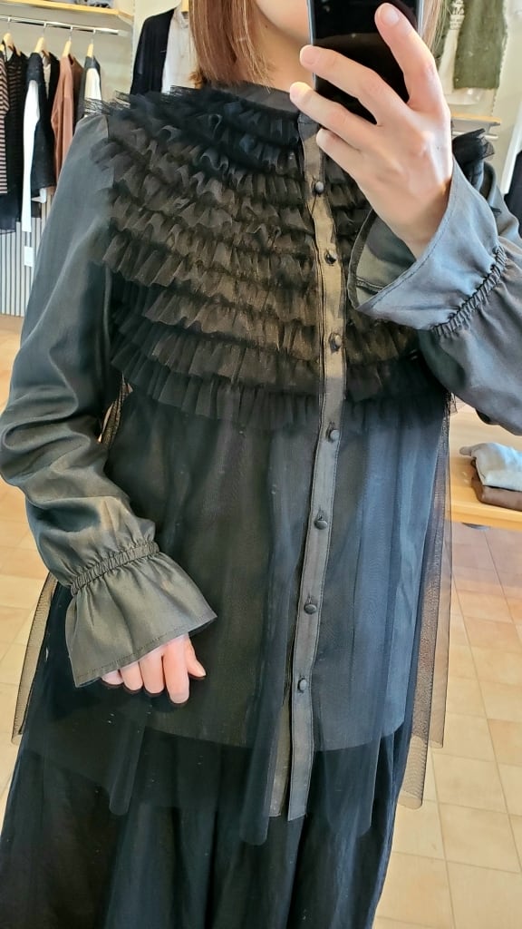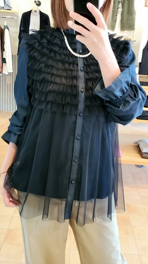 上品な艶のシャンブレーデニム生地にレイヤードしたチュールのミニフリルがアクセントになるデザインです。