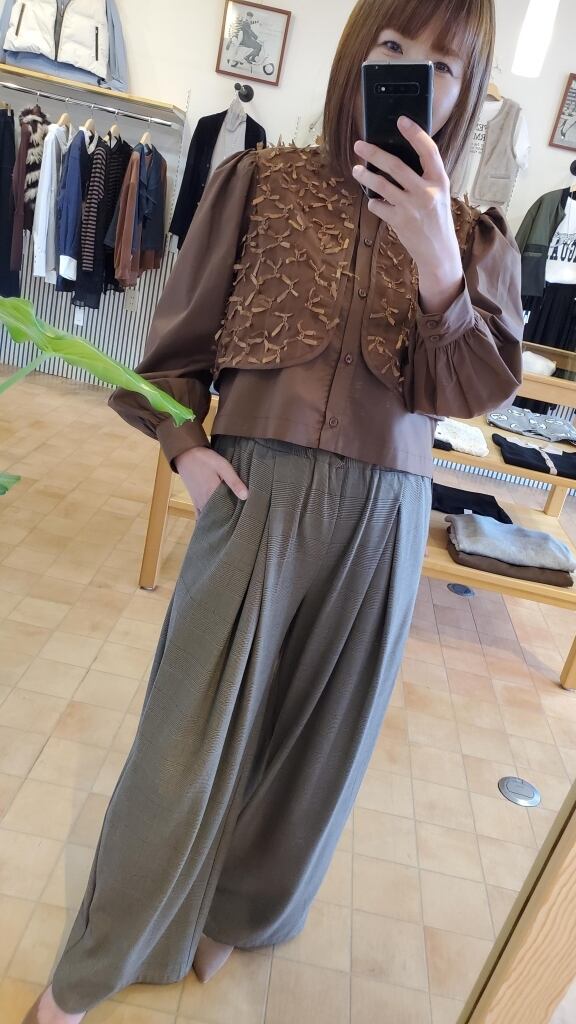 お袖ふっくらブラウスにリボンシャギーのジレをレイヤードしたような、一枚で華やかに見映えしてくれるデザインが魅力です☆