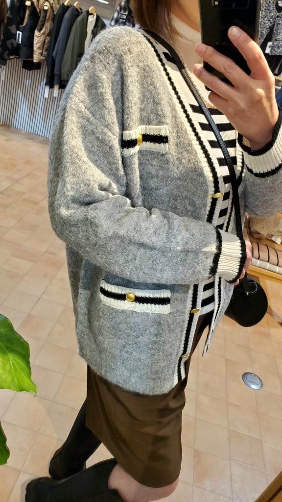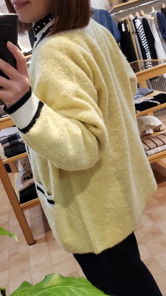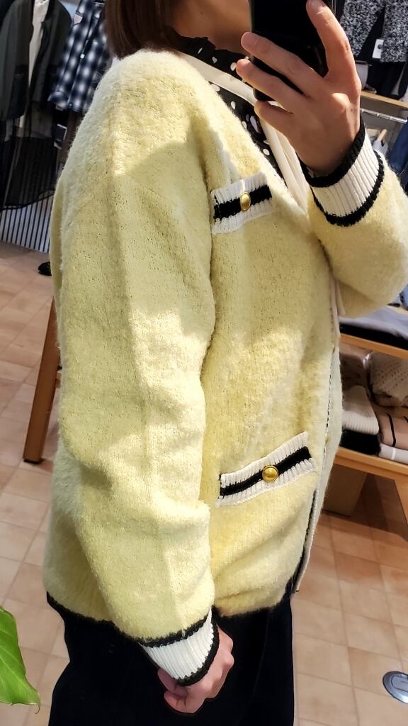 ふわふわモチモチのニット地に、ライン入りのリブやゴールドボタンで上品な雰囲気に仕上がります。