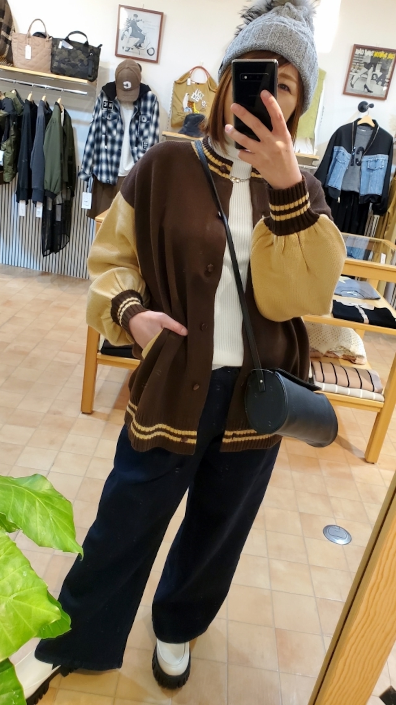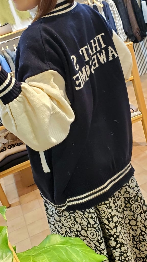 Tシャツの時期から寒い日の重ね着まで、バックロゴスタジャンニットでアクセントを効かせたコーディネートはいかがでしょうか^^