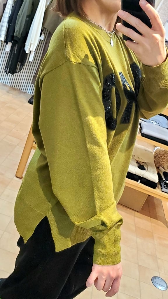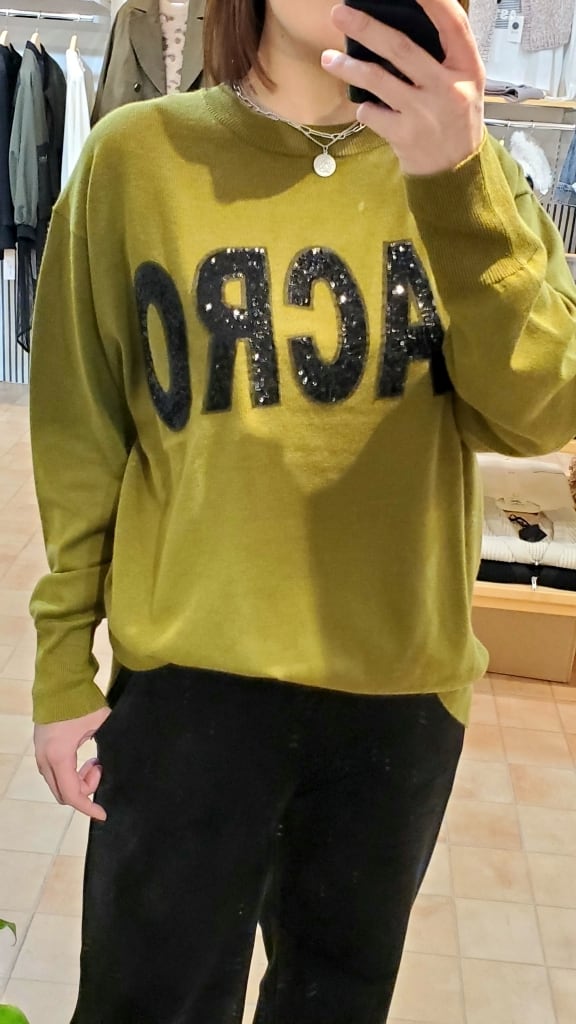 スパンコールロゴで一枚で華やかな印象に仕上がるニットプルオーバーです★