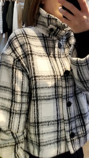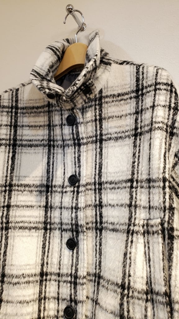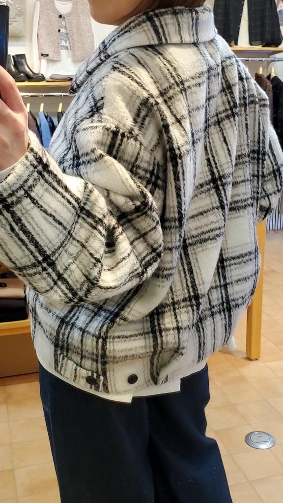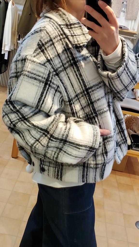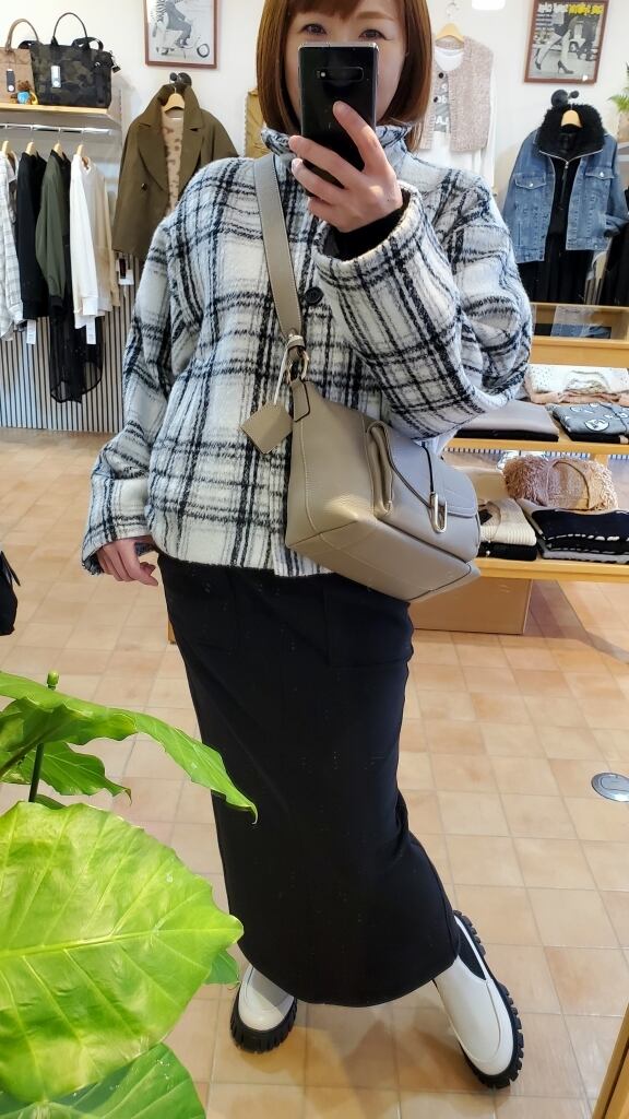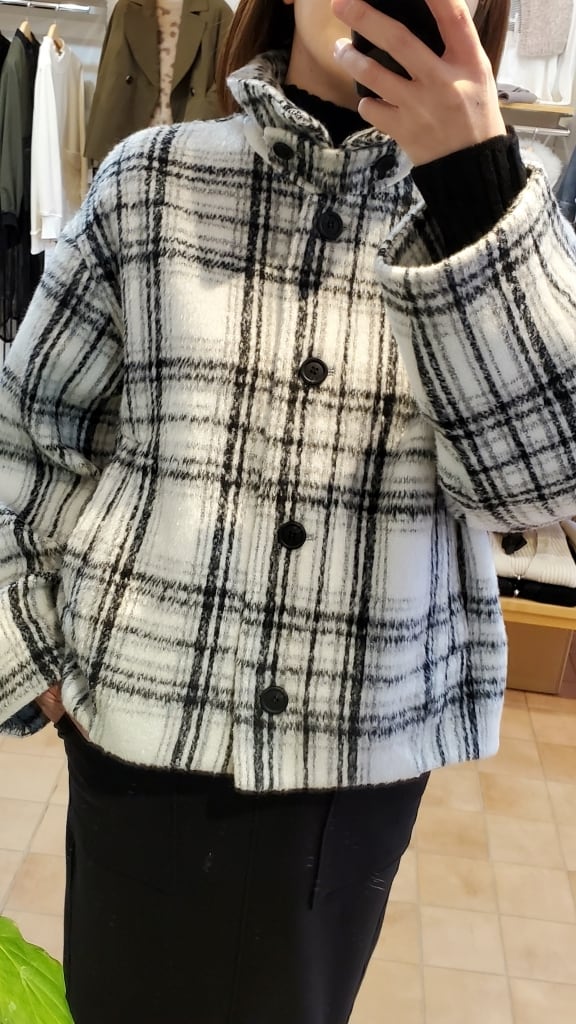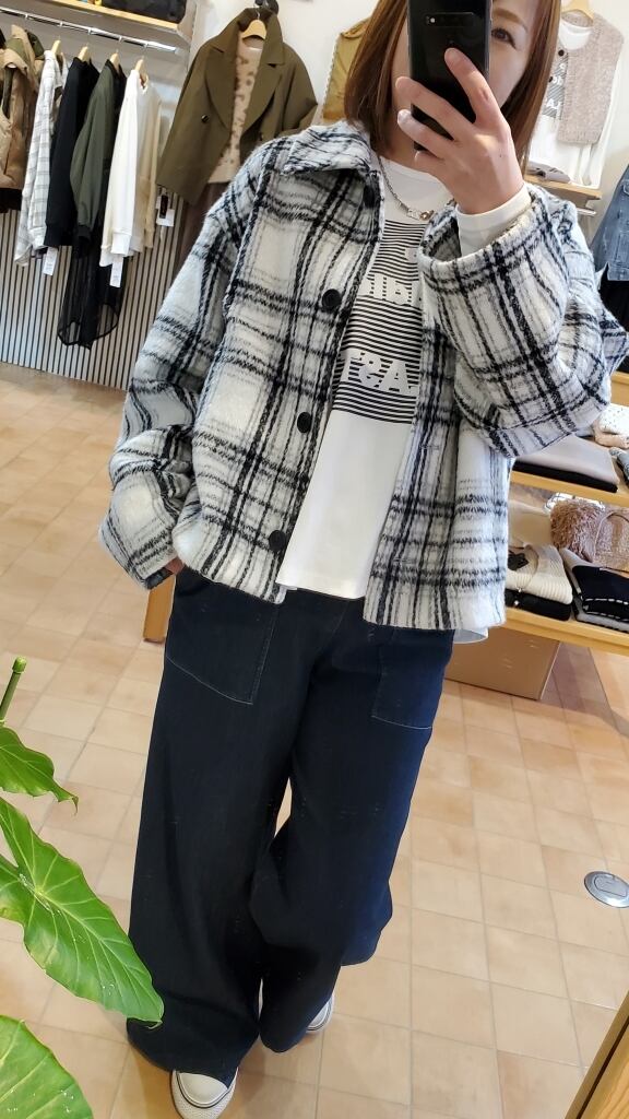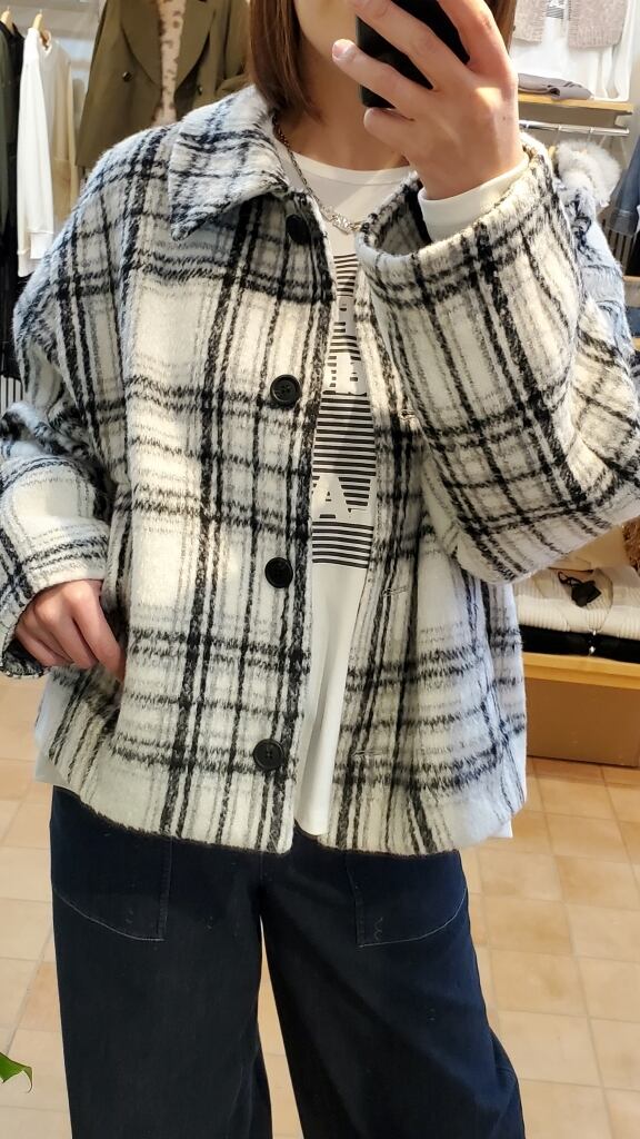 白ベースの爽やかなシャギーチェック柄で、今年の暖かアウターはおしゃれ度高めにキマります!