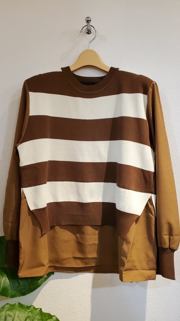 ブラウスにボーダー柄のニットベストをレイヤードしているような、お洒落なデザインが目を惹くドッキングのプルオーバーです★