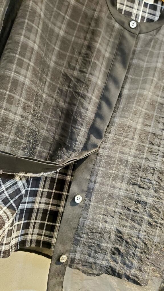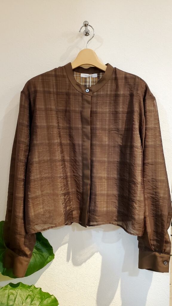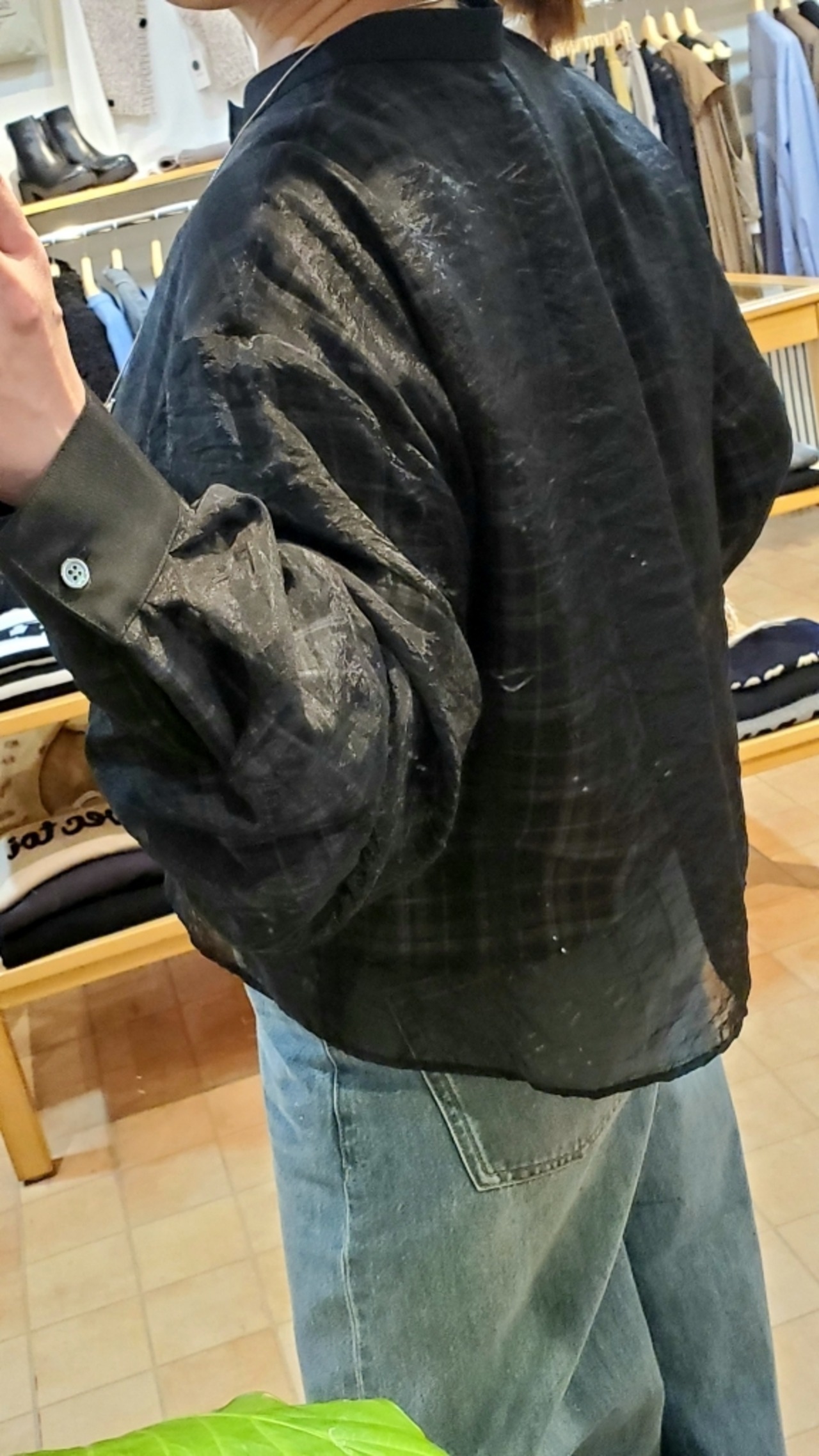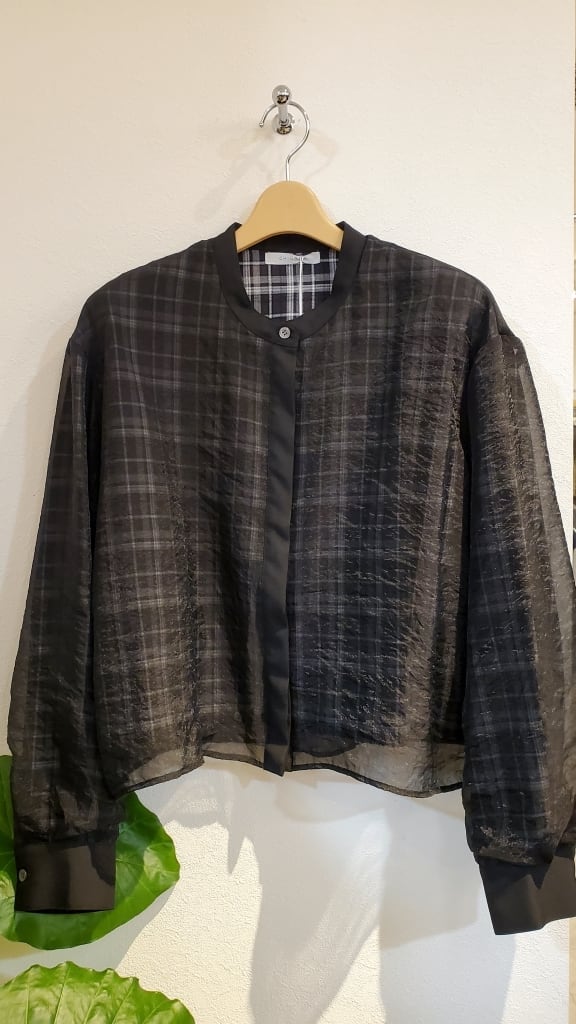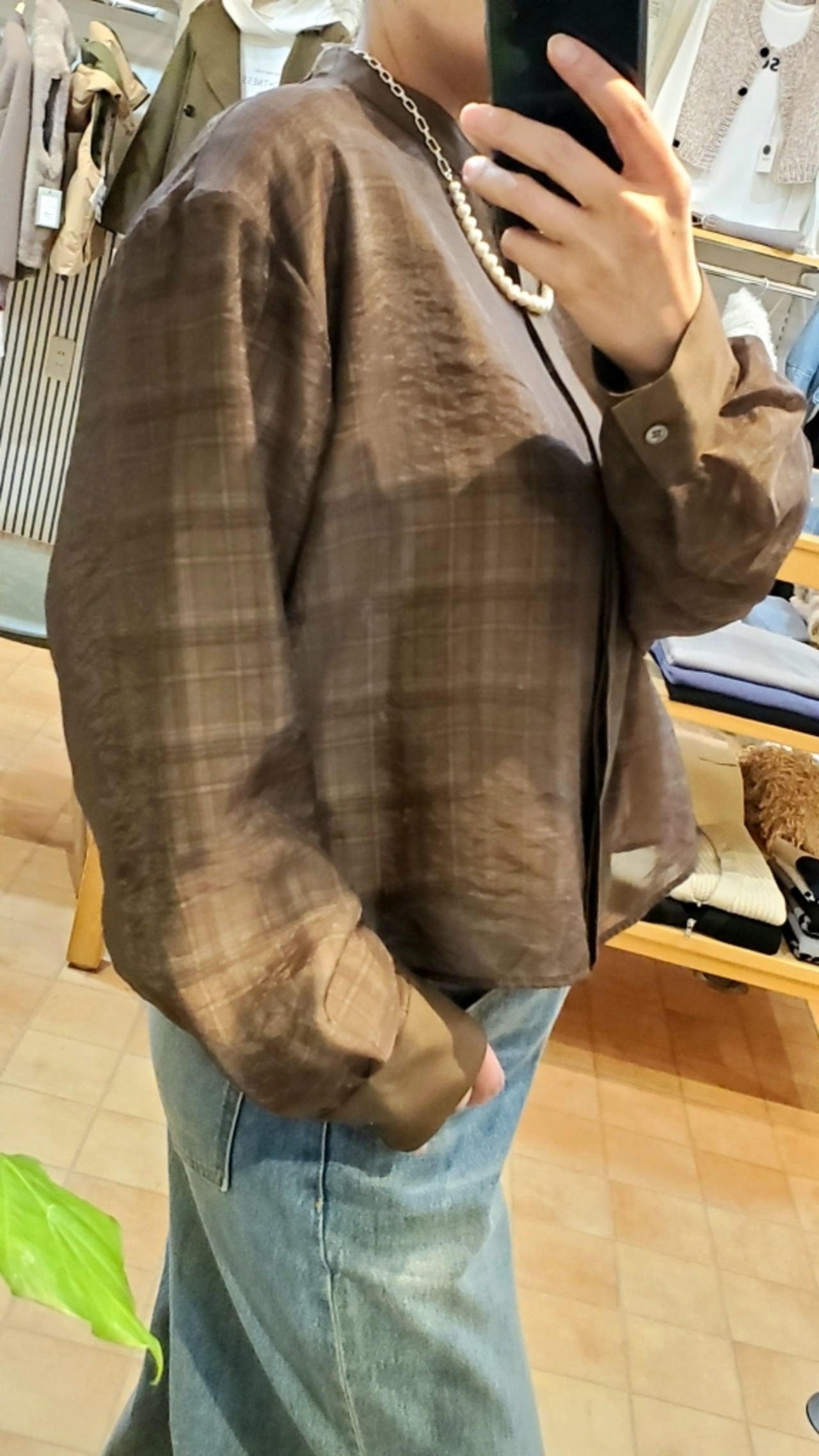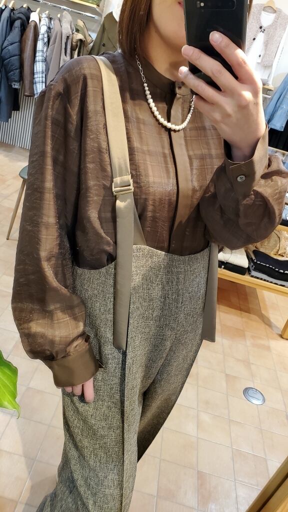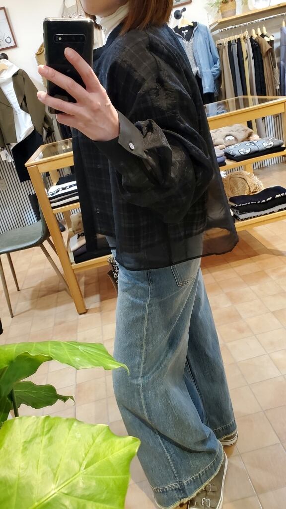 オーガンジーの透けから覗くチェック柄がさり気なくてとってもお洒落☆チェックのトラッド感に華やかさも加わり、一枚で着ても前開きで羽織ってもオシャレ度を上げてくれる主役シャツです。
