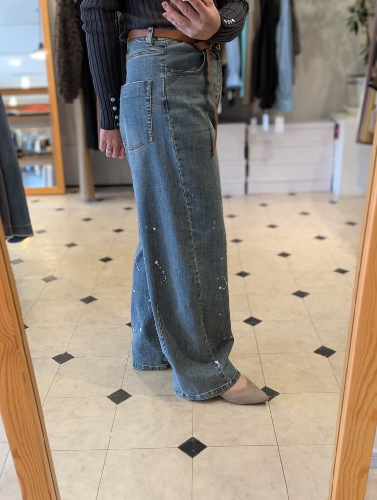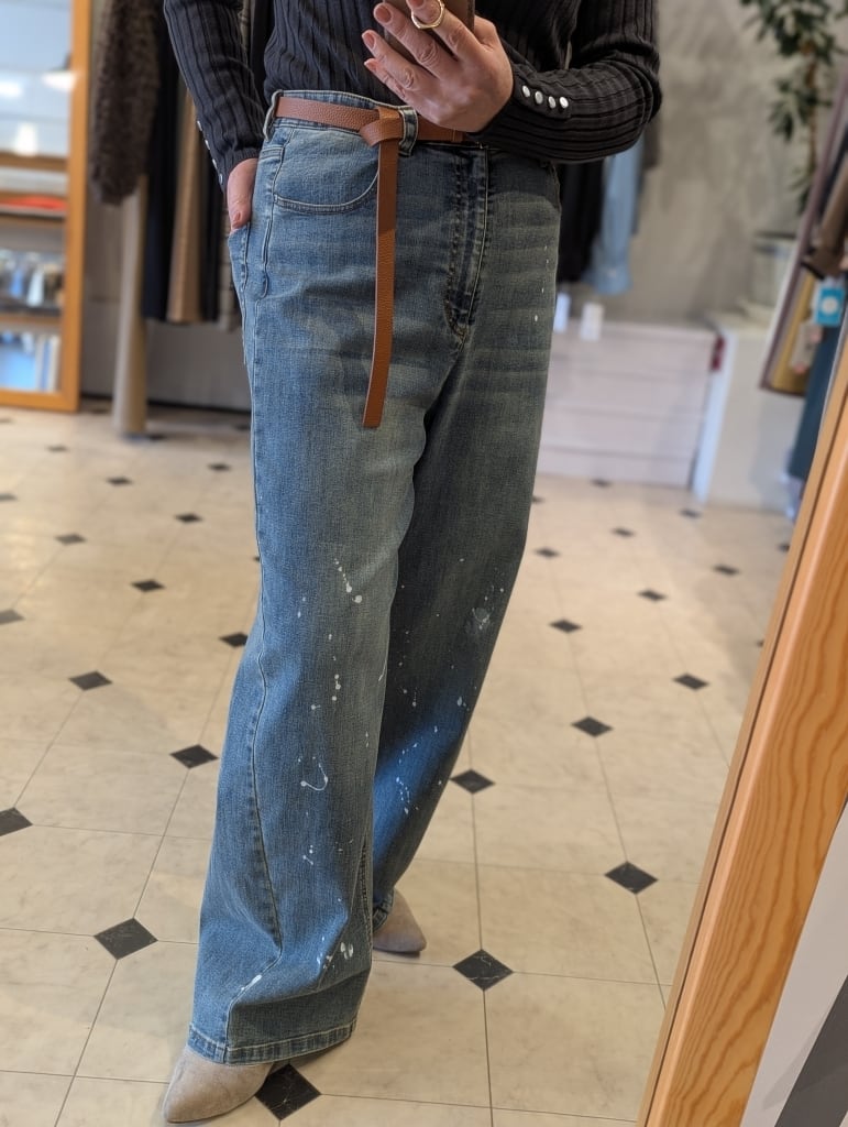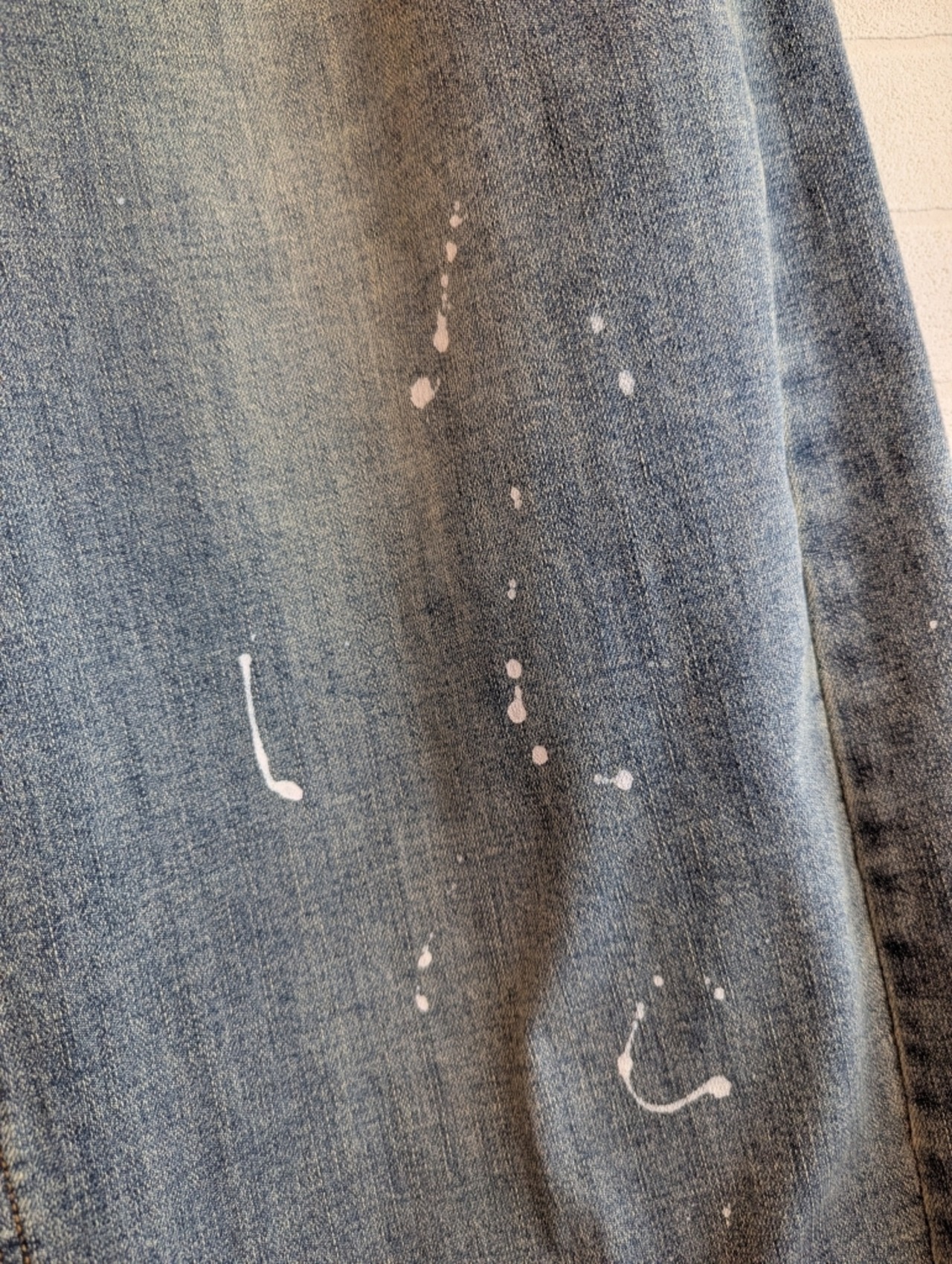 程よく色落ち加減のブリーチカラーに、手書きのペイントを入れた遊び感ある大人も楽しめるデザインデニムです。