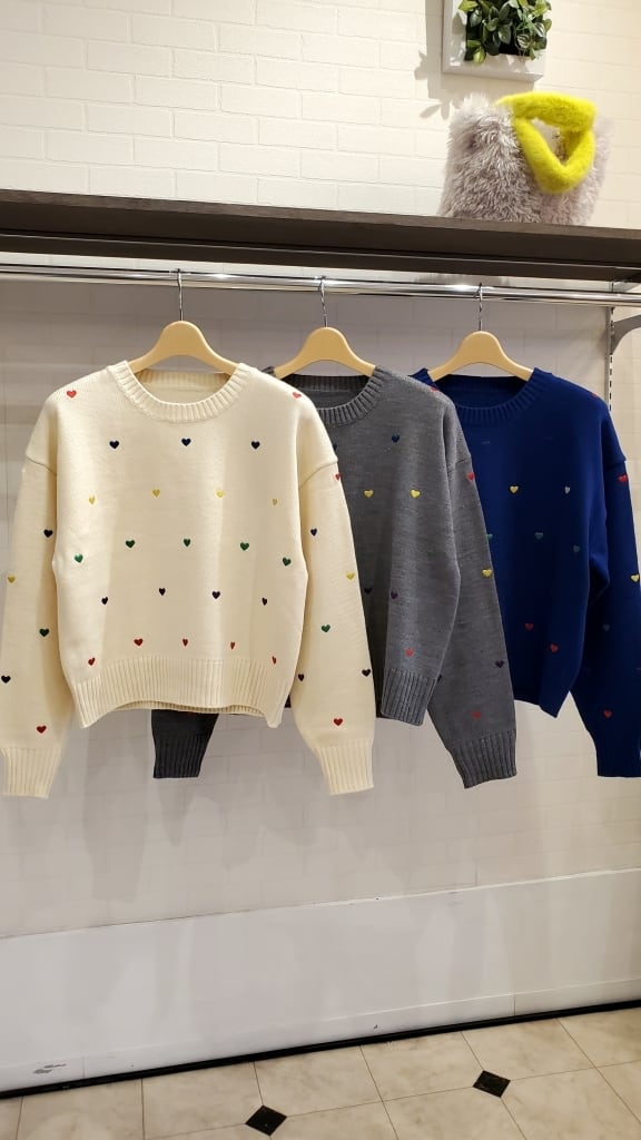 乙女心をくすぐるニット~♡カラフルなハート柄刺繍を前面・お袖に施した一枚で可愛さキマるニットです。