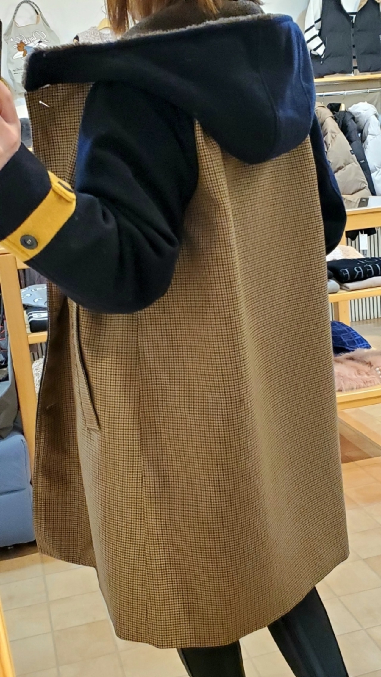 細かい千鳥チェック柄生地はウール/ポリエステル素材。お袖は軽くて暖かなウールメインの素材。お顔周りにはボア付きで温もり3素材MIXのお作りです。