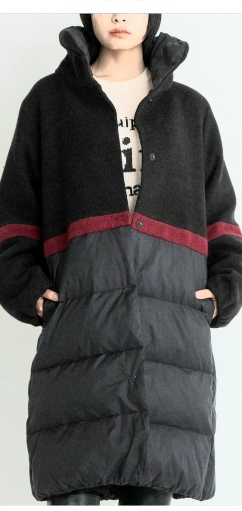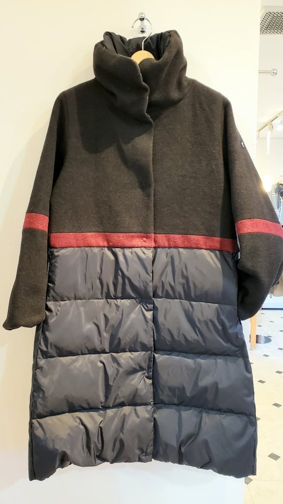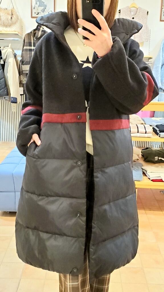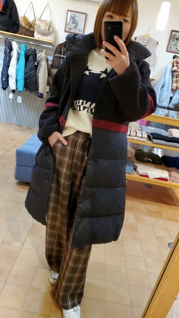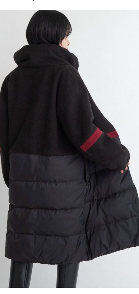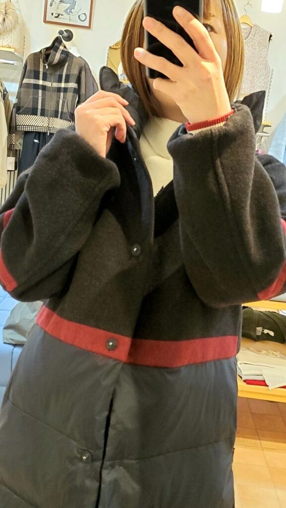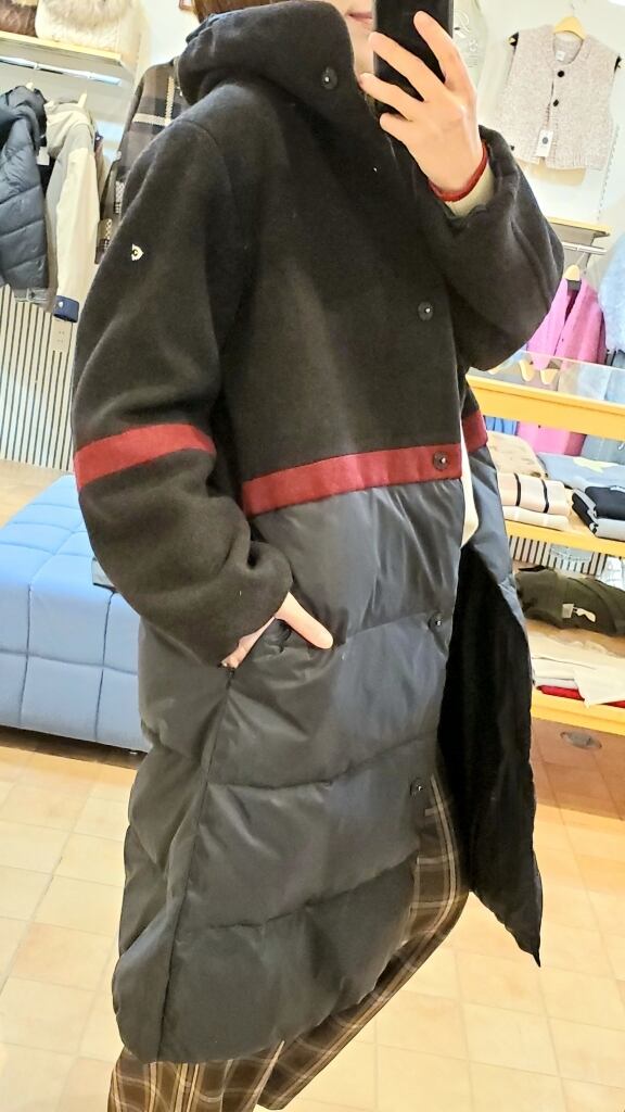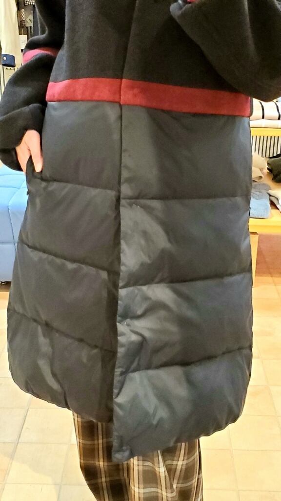 ライトな着心地のウールメルトンの上身頃に、ウエスト下はダウン/フェザーのダウンコートを切り替えて、軽い着心地で脚までしっかり温かなお作りです。ハイネックの衿裏もダウン素材で暖かをホールドしてくれます。