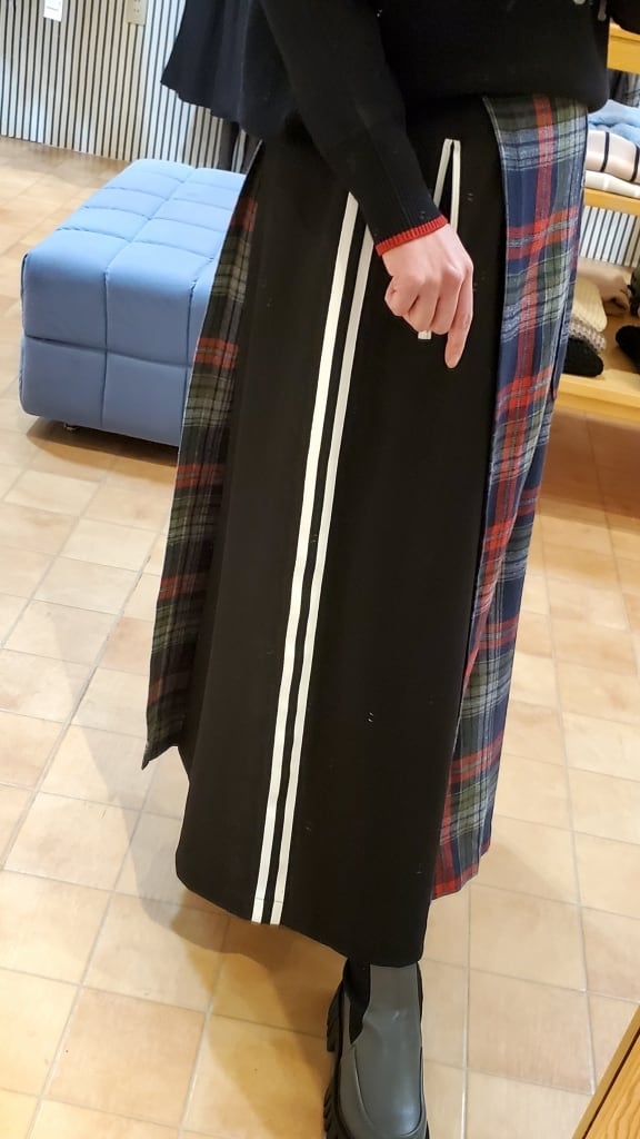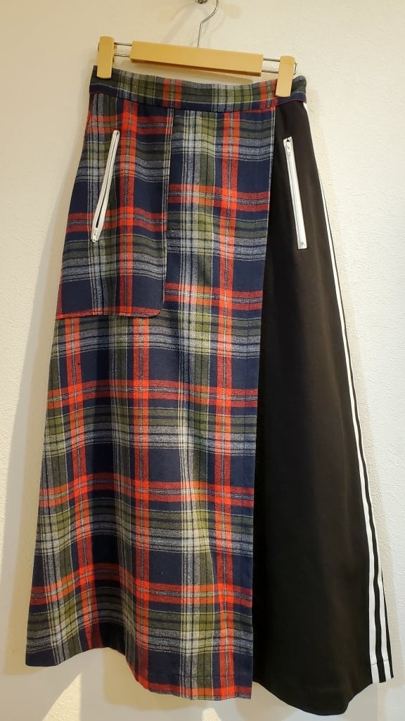 チェック部分はネル素材。ライン入りのカットソーポンチ素材を切り替え、スポーティとトラッドカジュアルな雰囲気を一度に楽しめるスカートになっています。