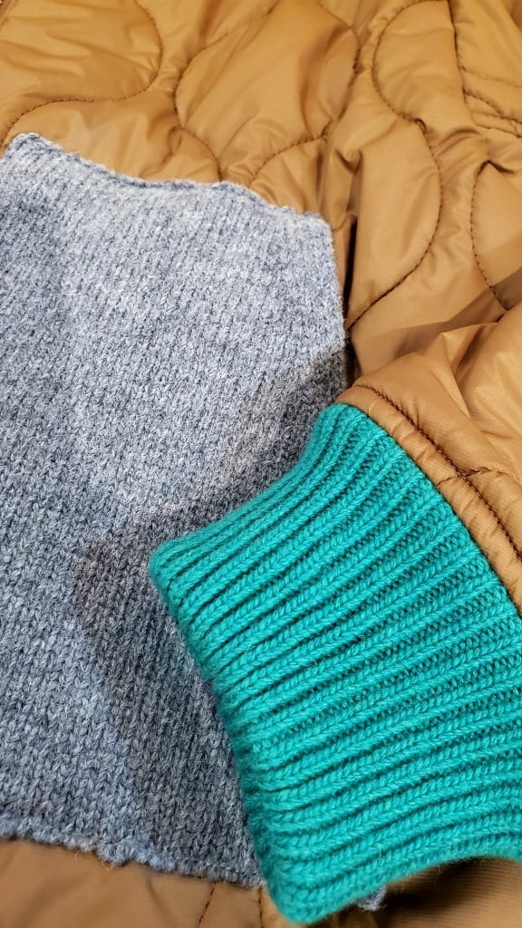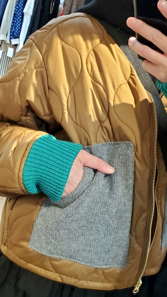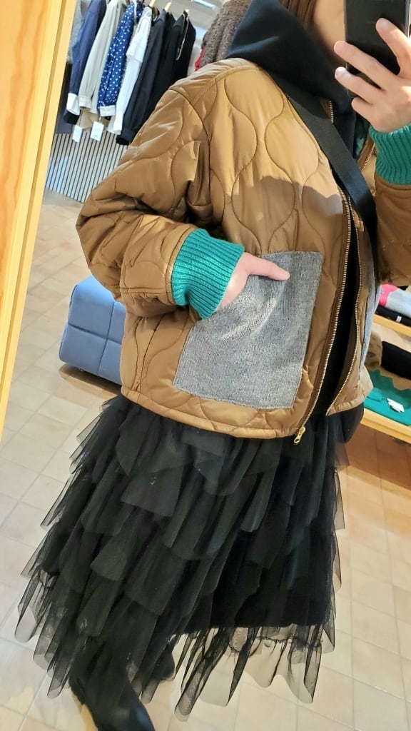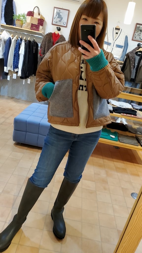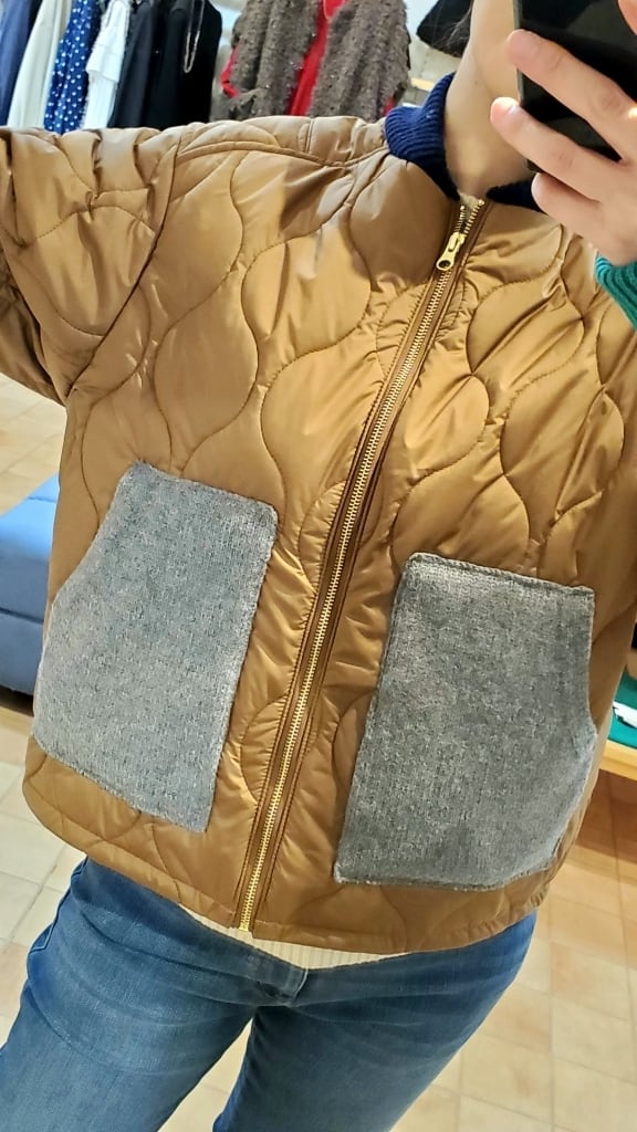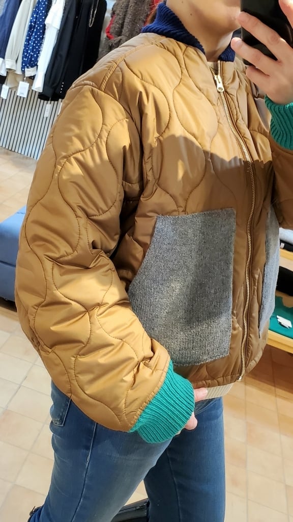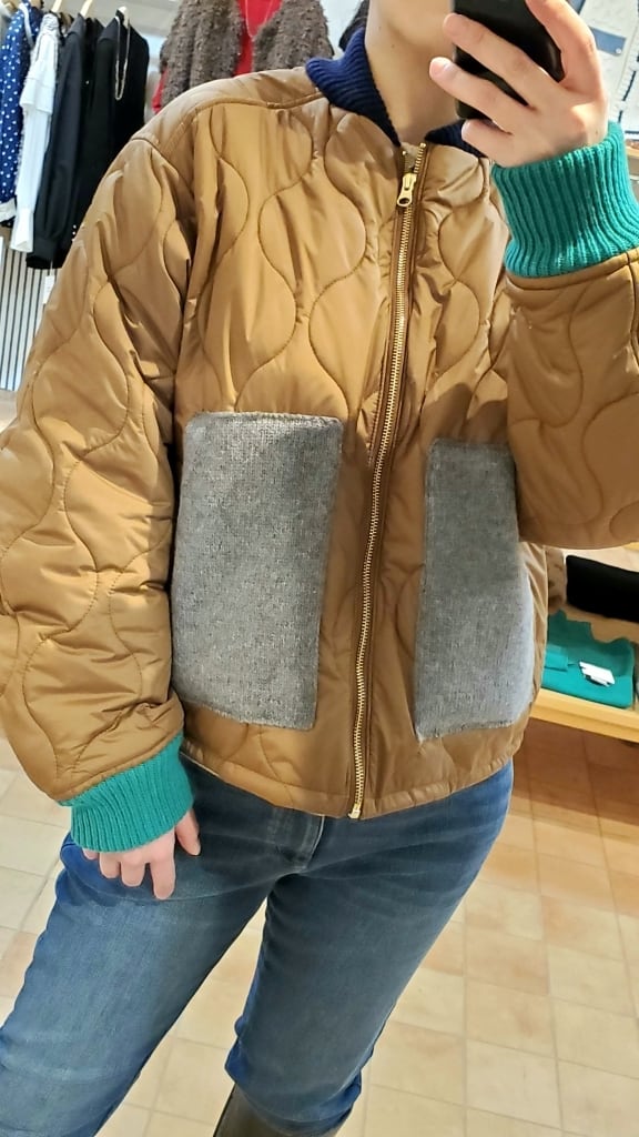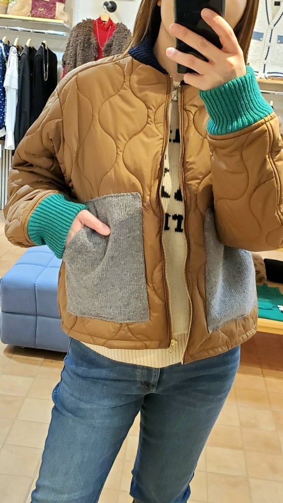 明るい印象のテラコッタカラーに、ニット素材でグレーのポケット、ネイビーの衿元、そしてグリーンのお袖リブと配色を効かせて遊び心満載☆☆
