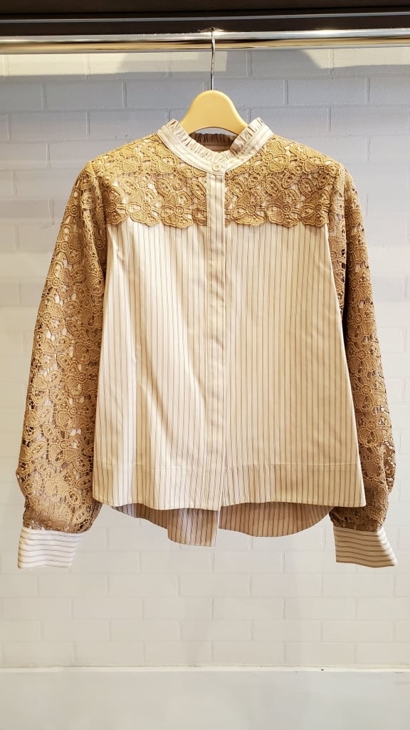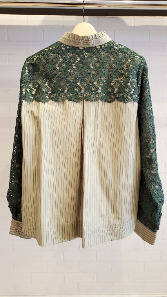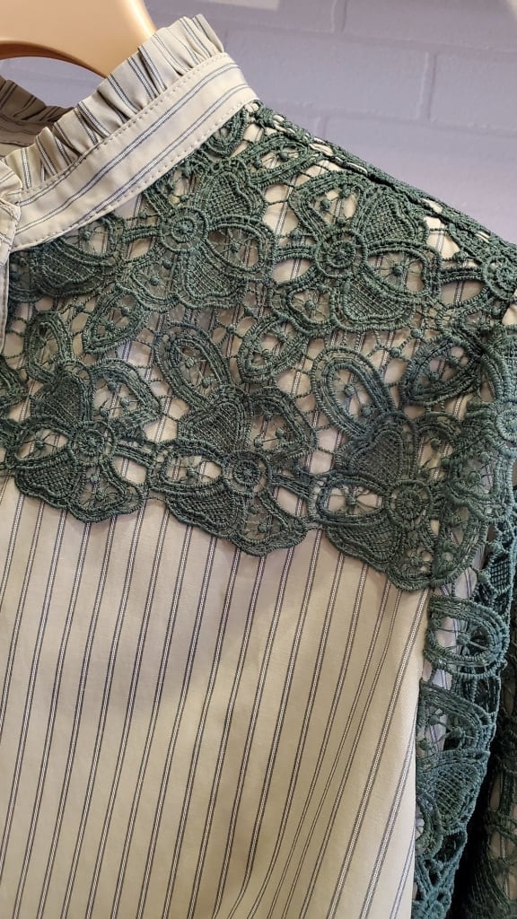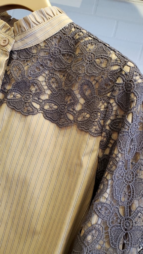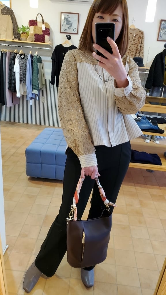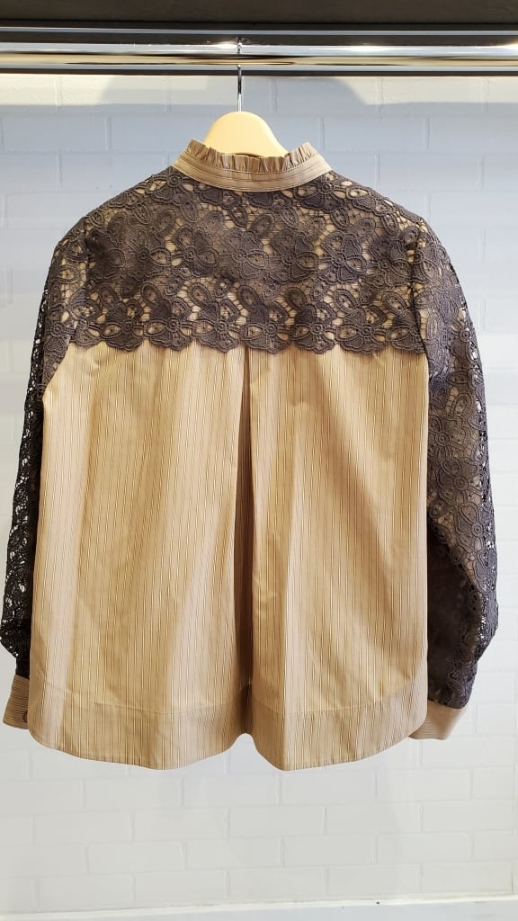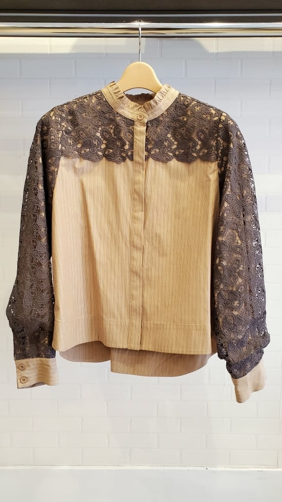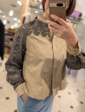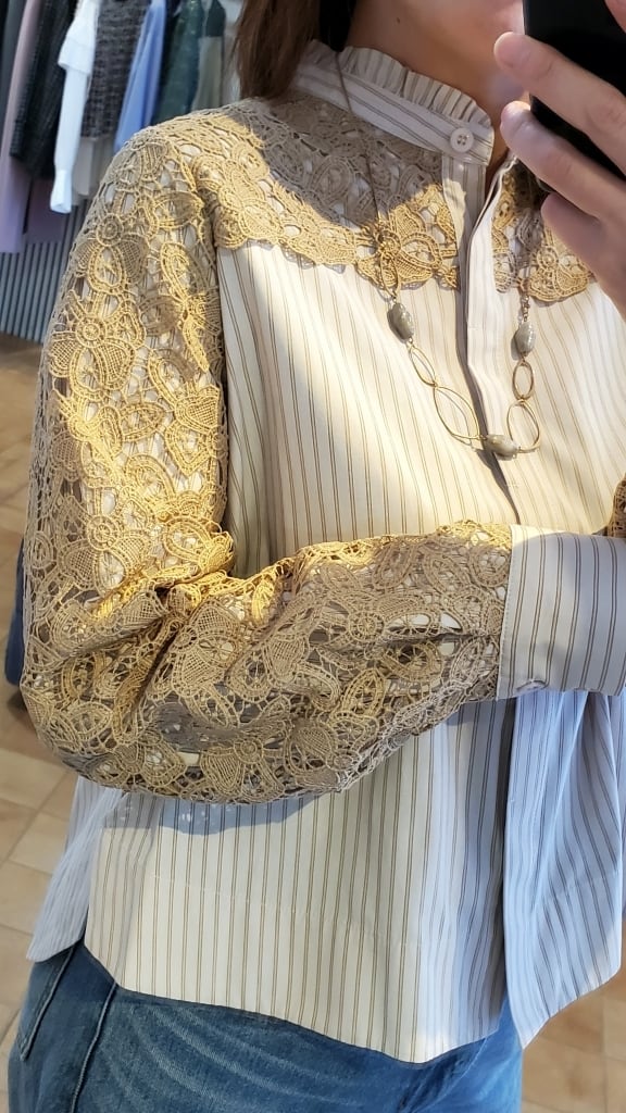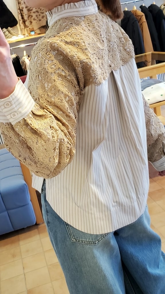 ストライプブラウスに肩・お袖のレースをあしらったコンビブラウスです☆