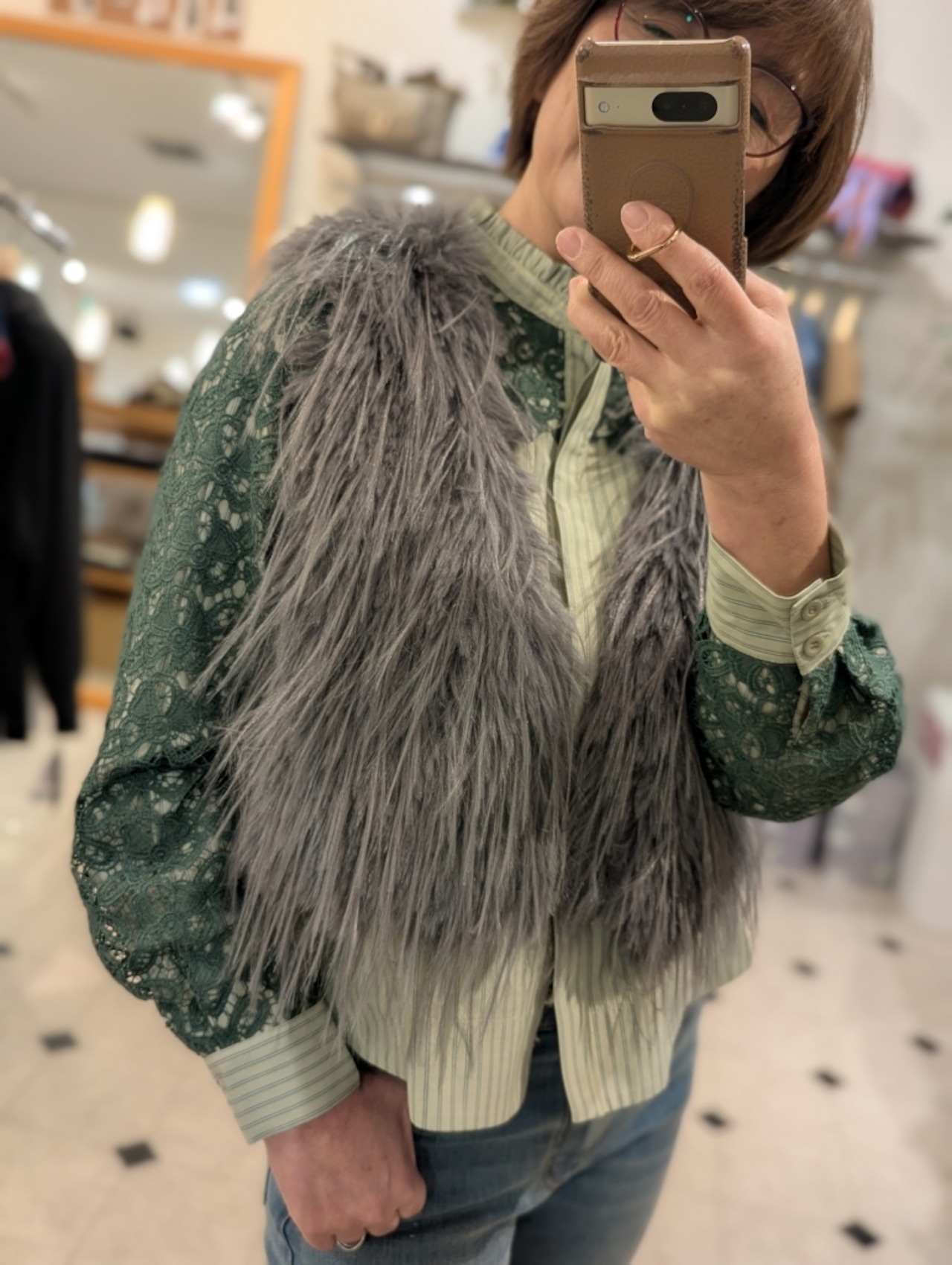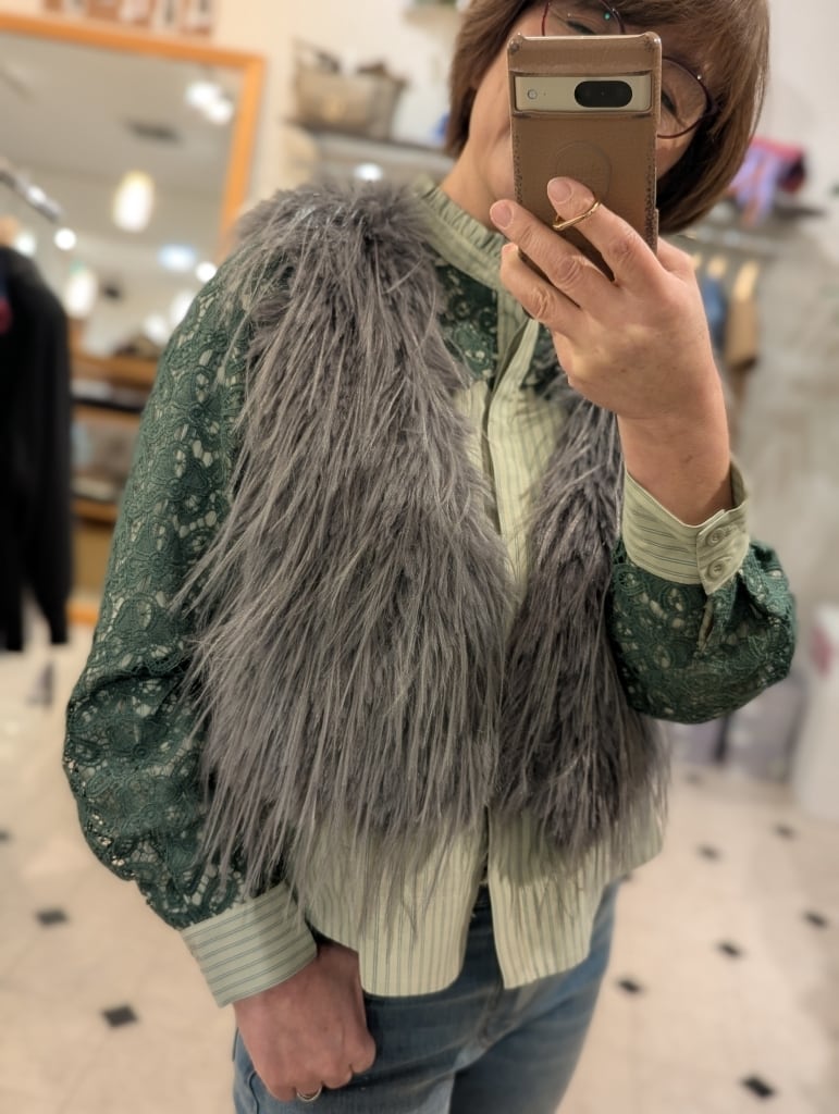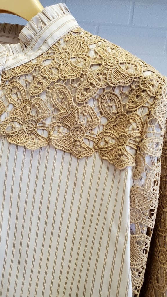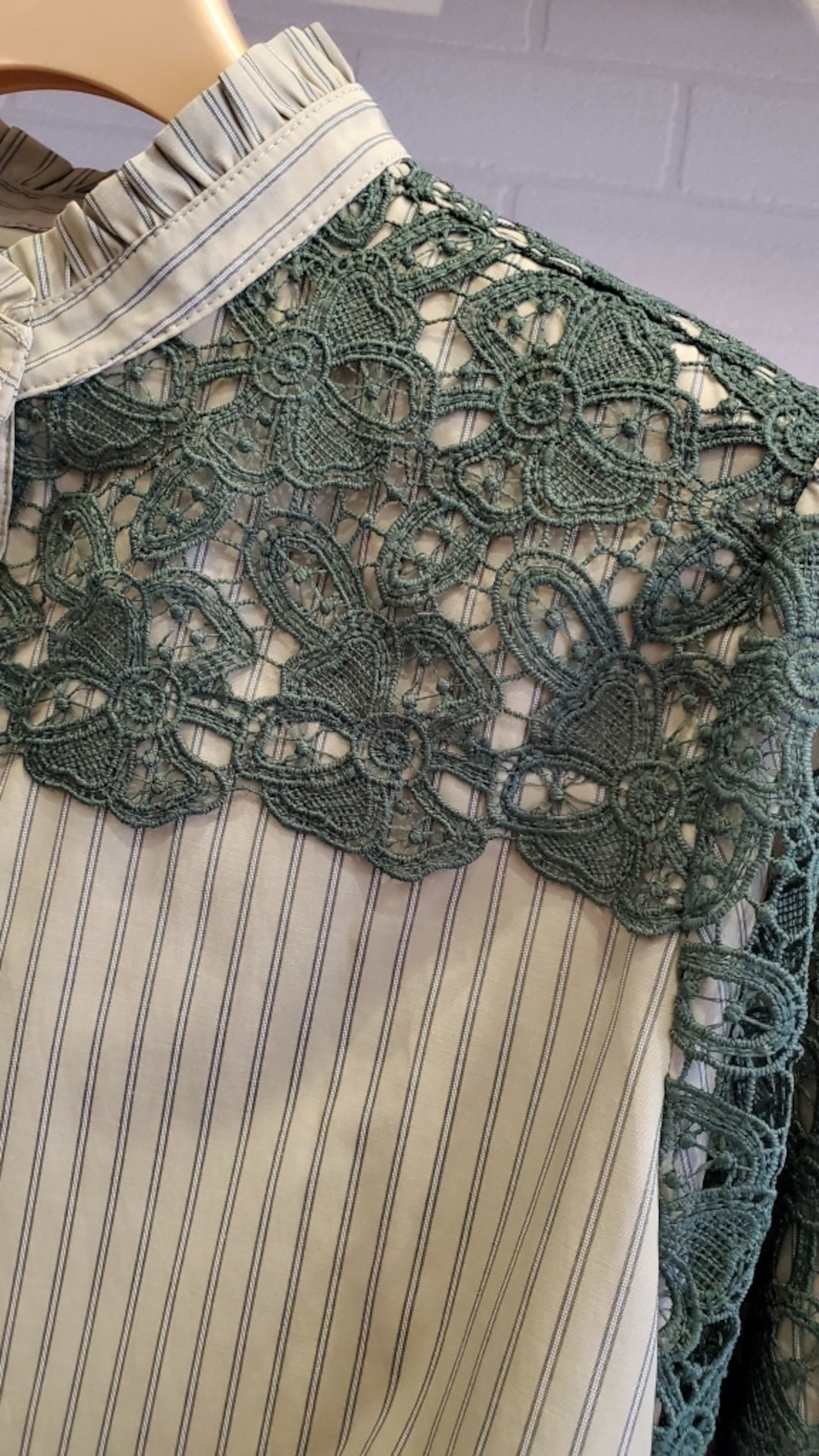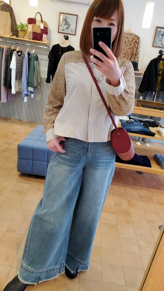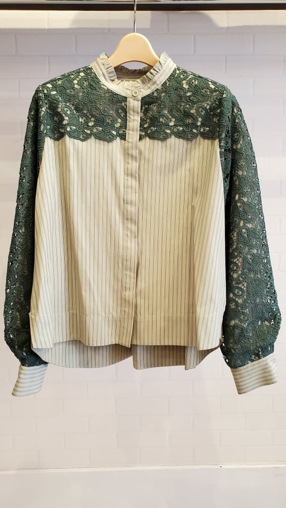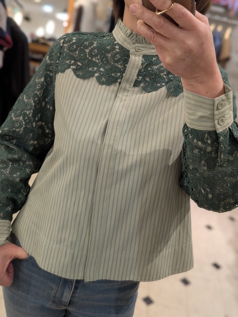 ストライプブラウスに肩・お袖のレースをあしらったコンビブラウスです☆