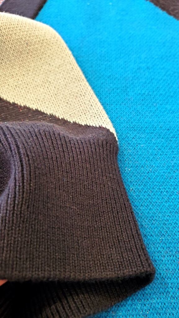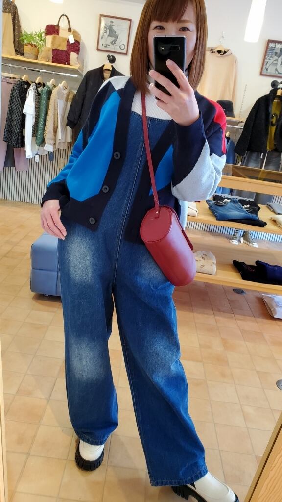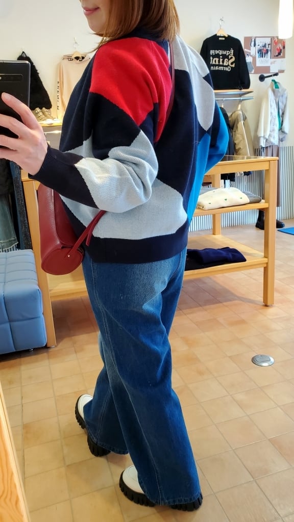 ネイビー地にブルー、レッド、ホワイトのお色が目を惹き、ハイゲージインターシャの編地で上品トラッド見せしながらも遊び心もたっぷり。ふんわりとした着心地もおすすめポイントです★