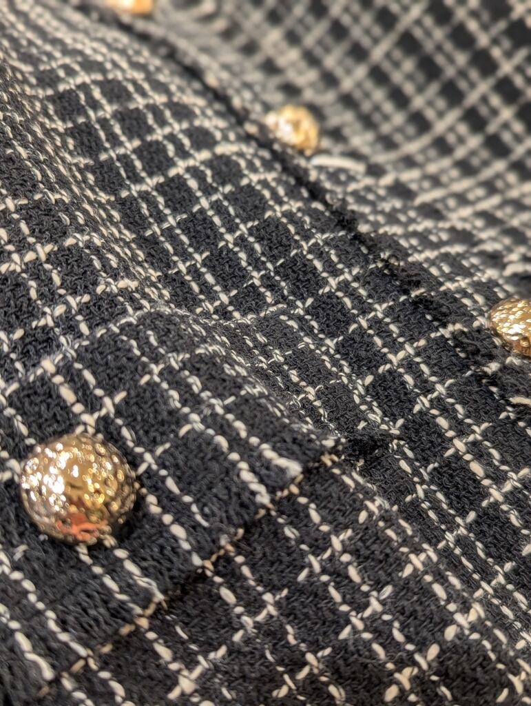 ぷっくりと丸い金ボタンと断ち切りのフリンジが女性らしいポイントになっています。