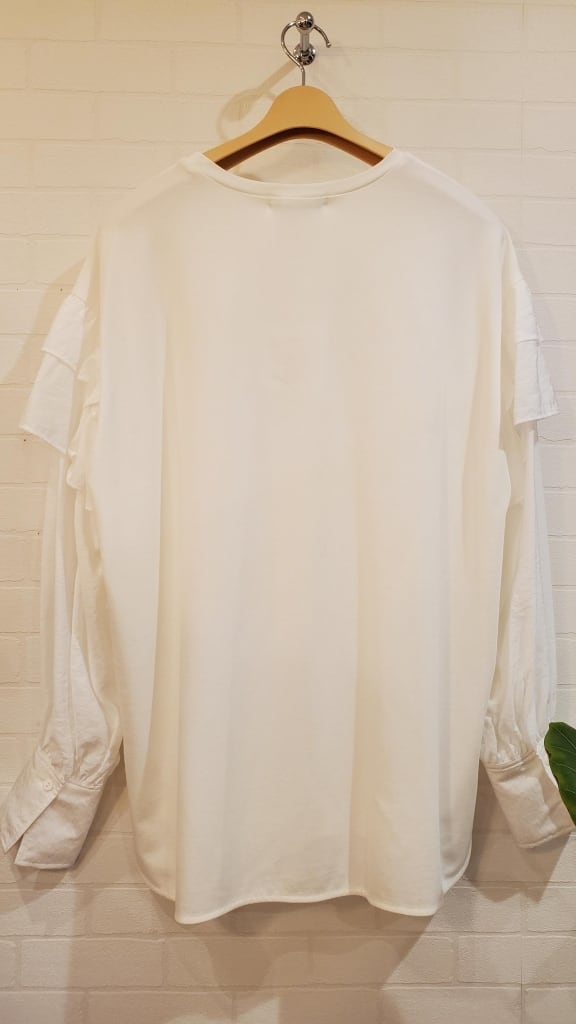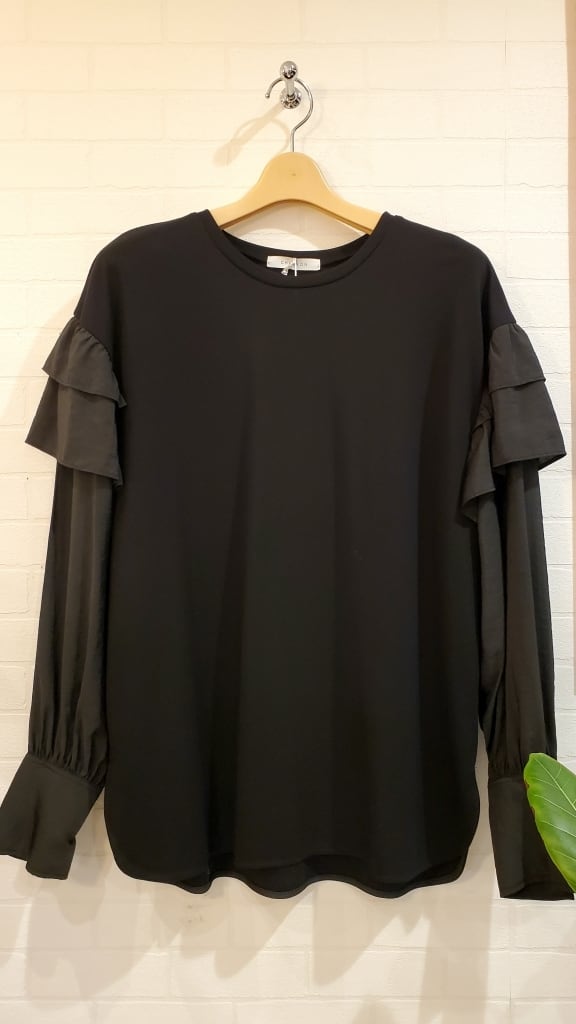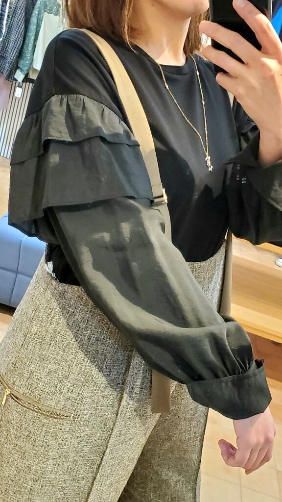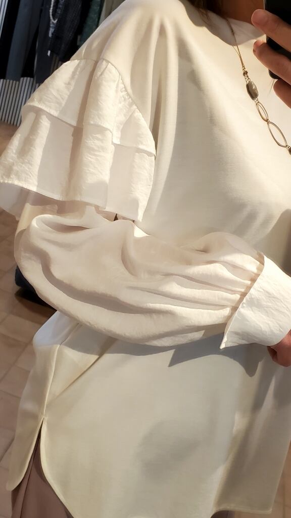お袖に切り替えたブラウスは程よいボリューム感と落ち感が女性らしく、二の腕をカバーしながらエレガントなアクセントになってくれる二段フリルで、動くたび魅力的なトップスに仕上がっています。