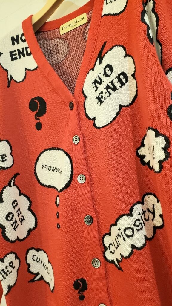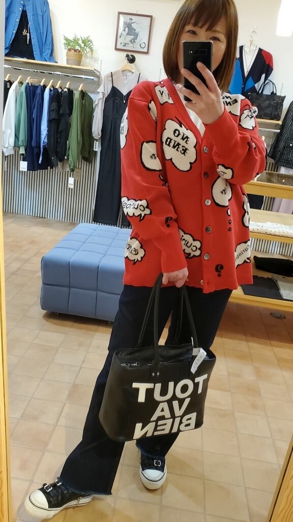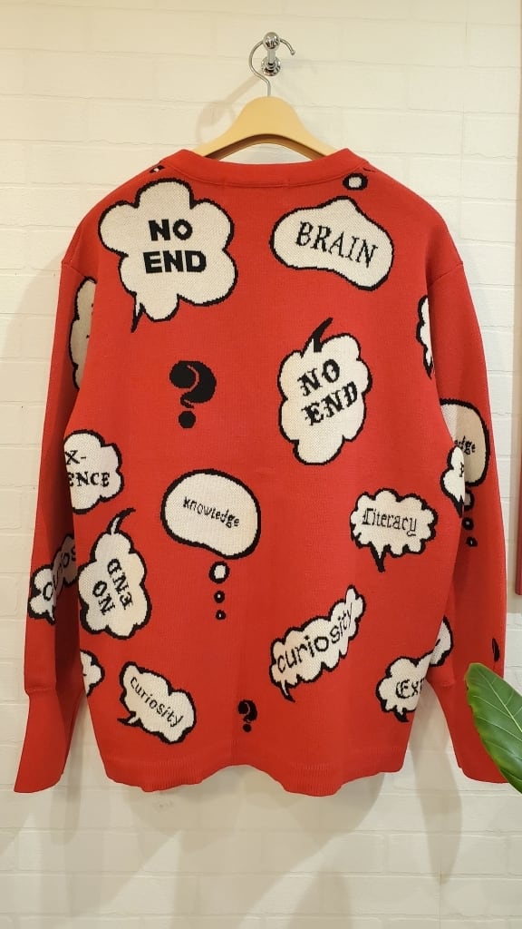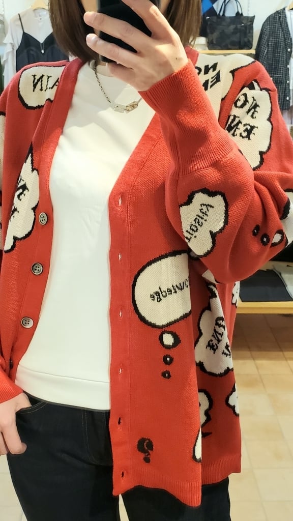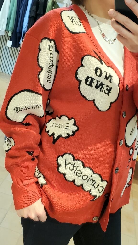 全体に散りばめられた多種のオリジナル手書き文字がお洒落な、ジャカード編みオーバーサイズカーディガンです☆