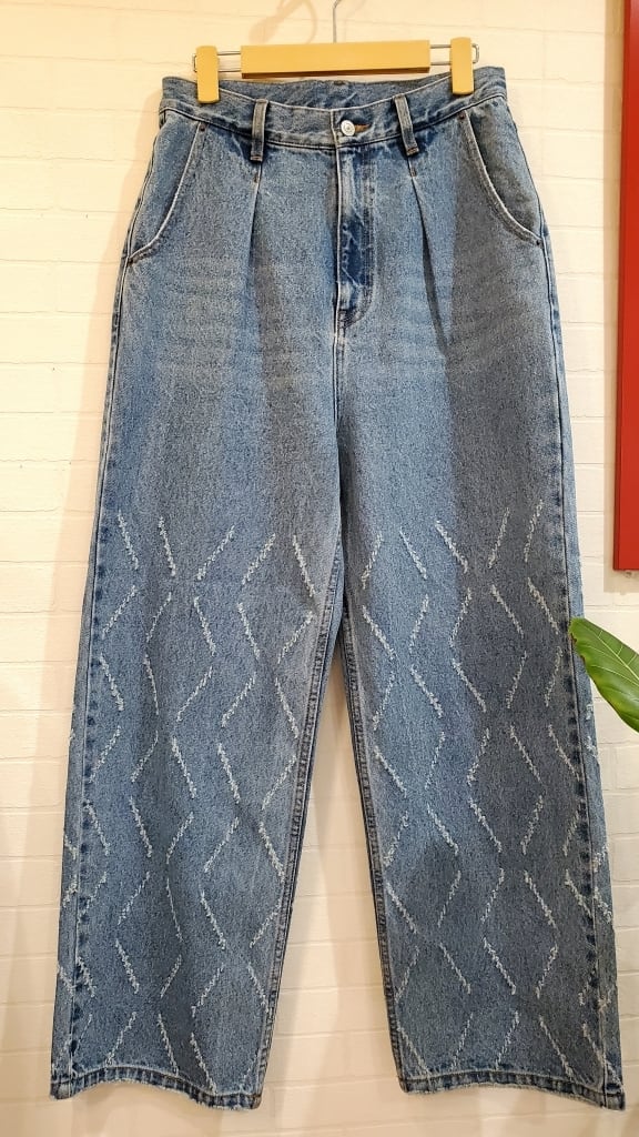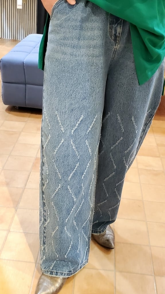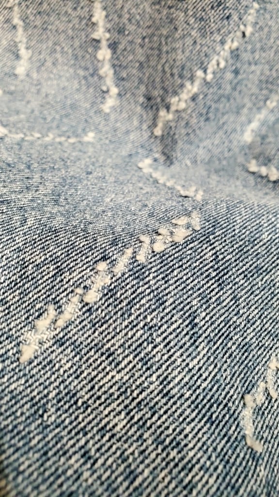 レーザー加工でオリジナルのジオメトリック柄を表現した、アート感覚な存在感デニムです。