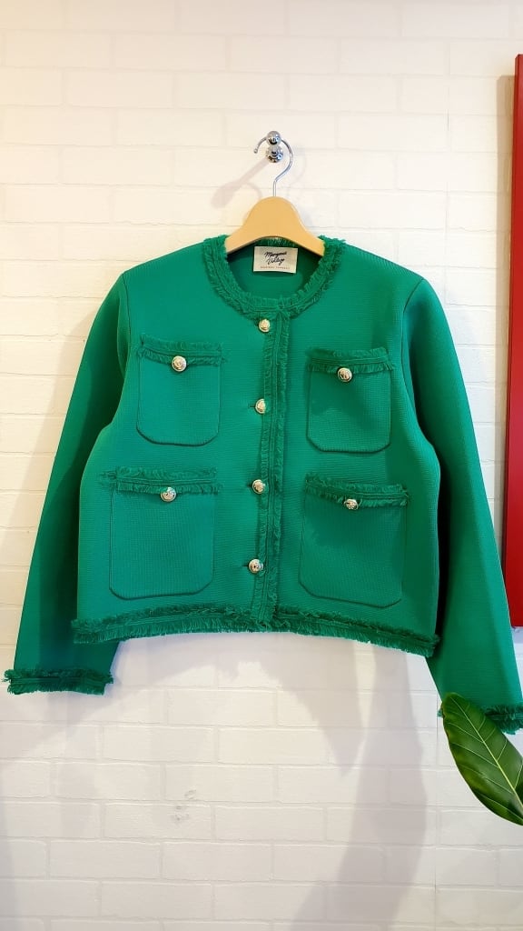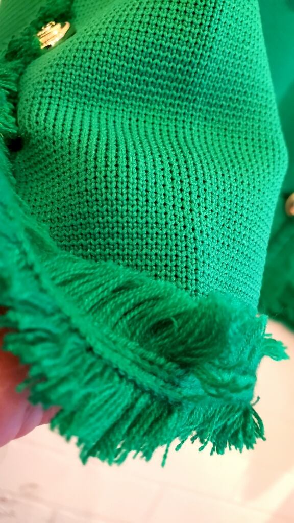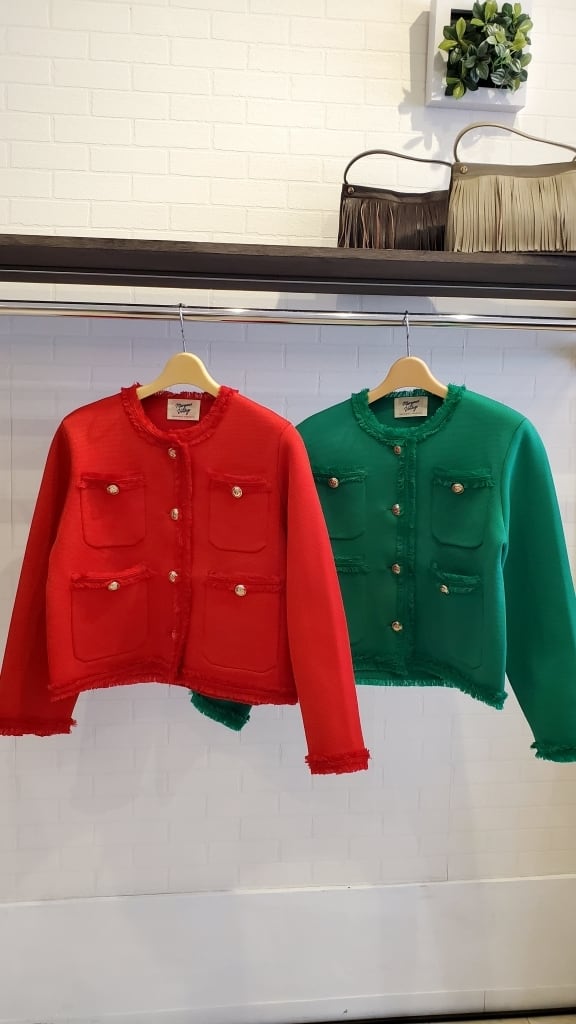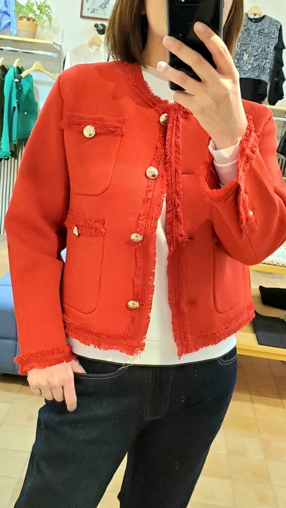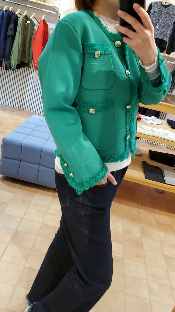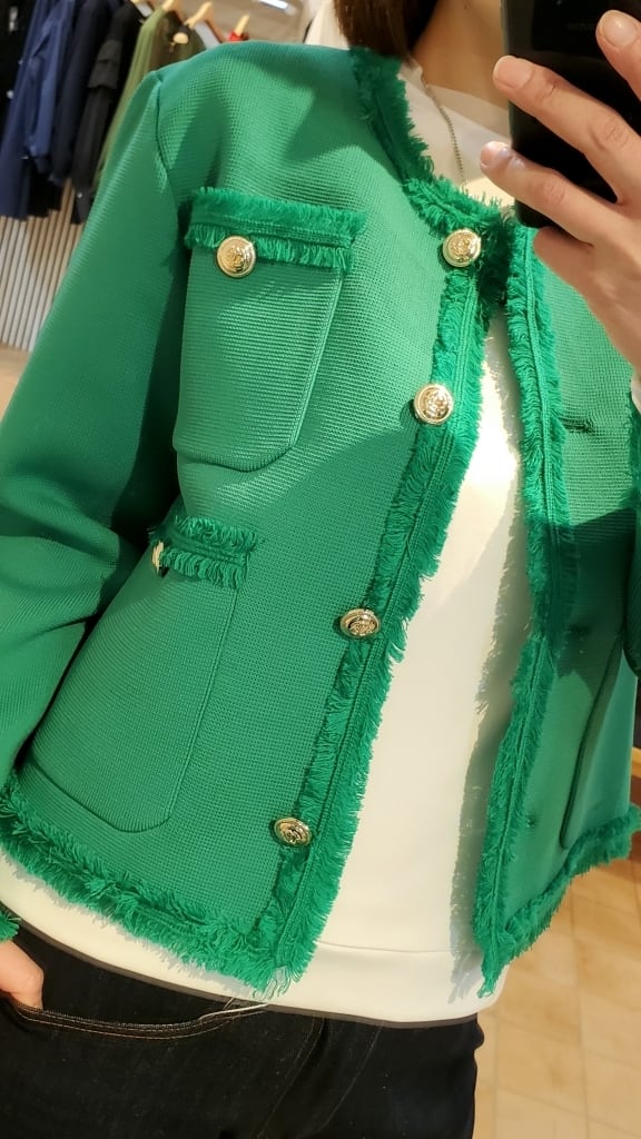 フリンジの縁とゴールドボタン使いがお洒落なノーカラーニットジャケットです☆