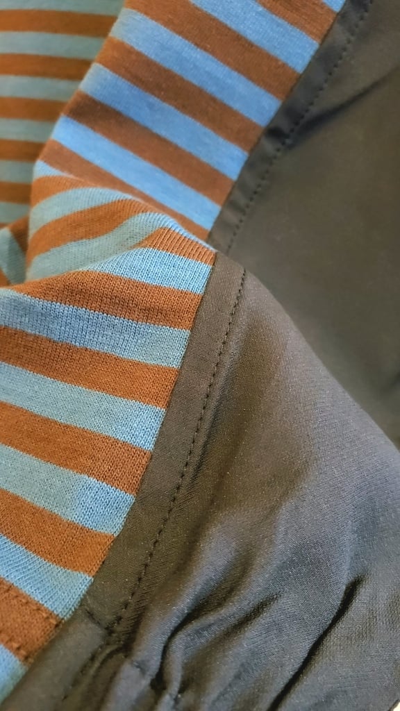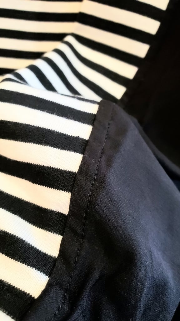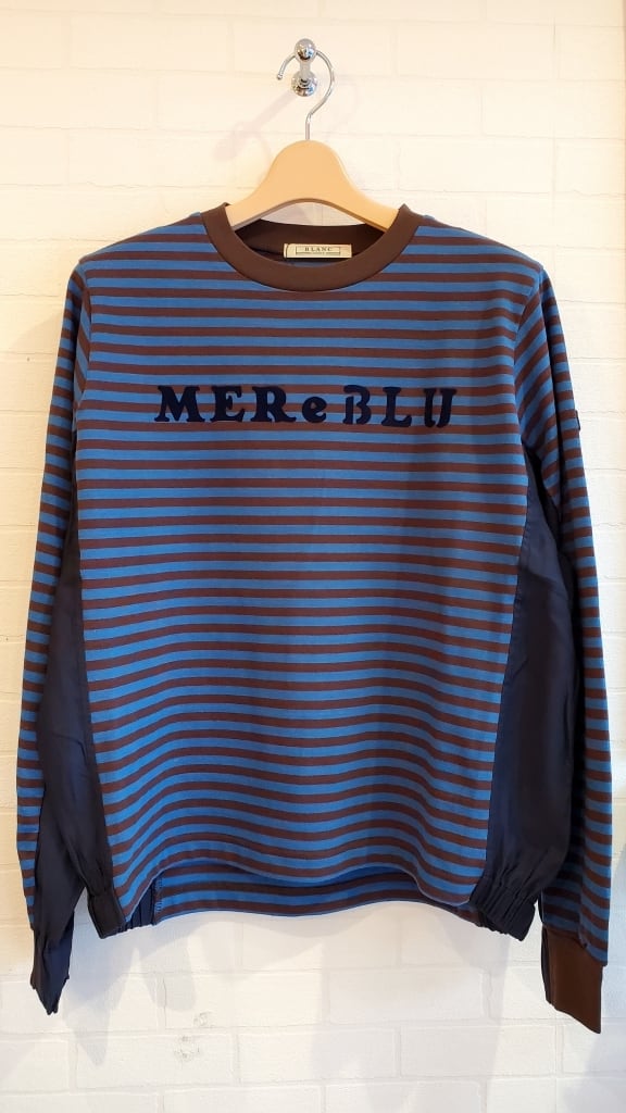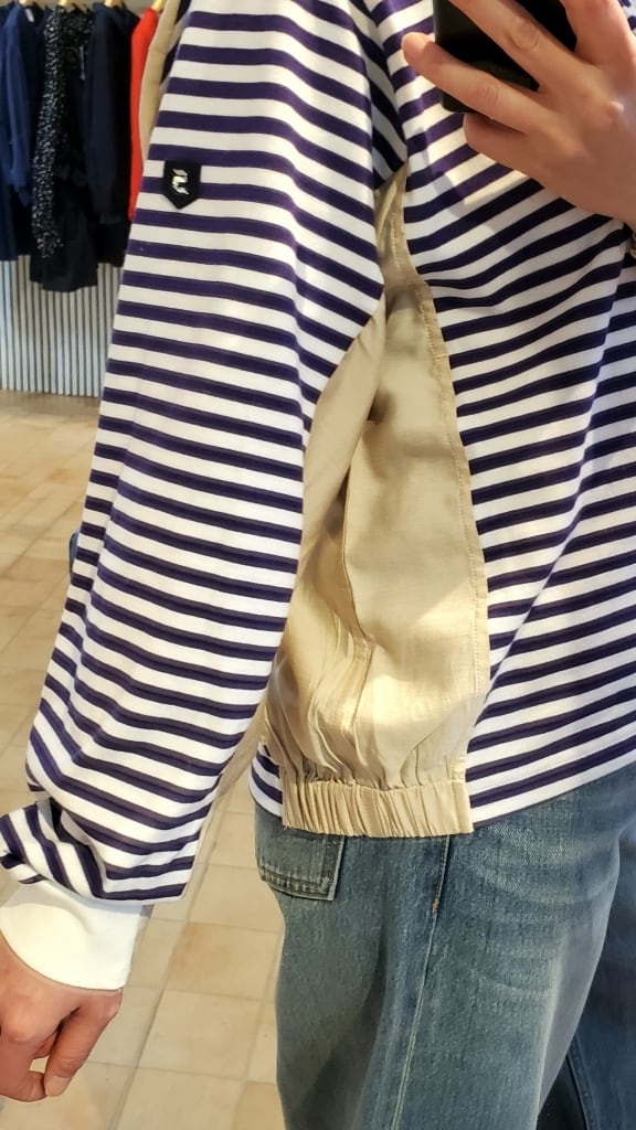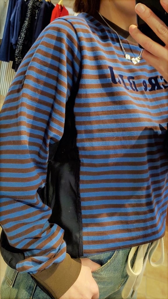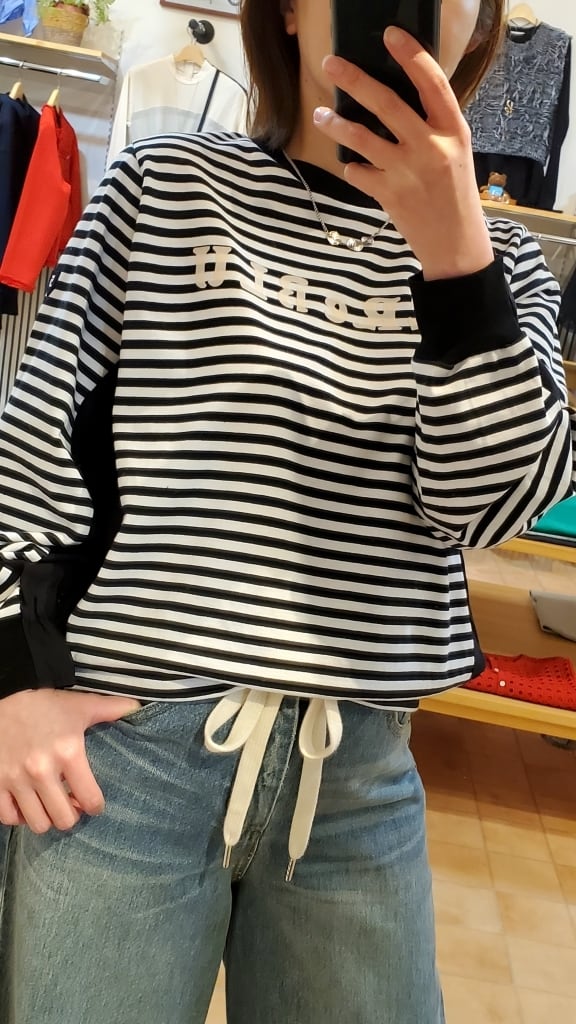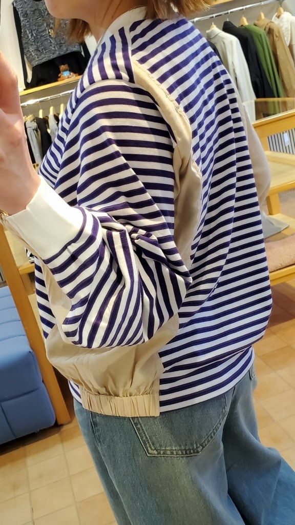 しっかりとしたコットン素材のボーダー柄生地の身頃。さらりと薄手で艶感のある布帛を切り替えた、快適かつ一枚でデザイン性を楽しめるプルオーバーです☆