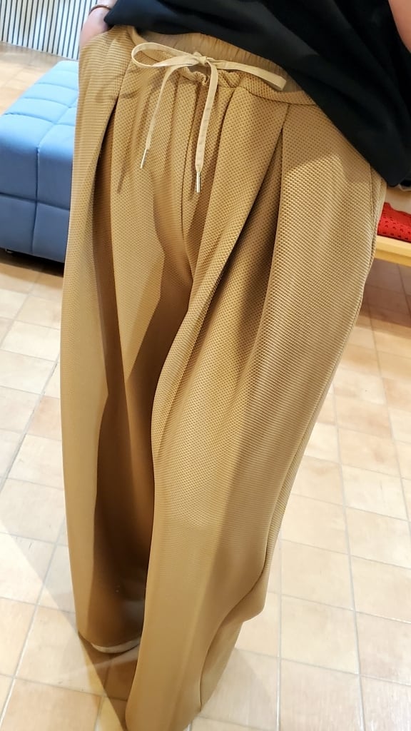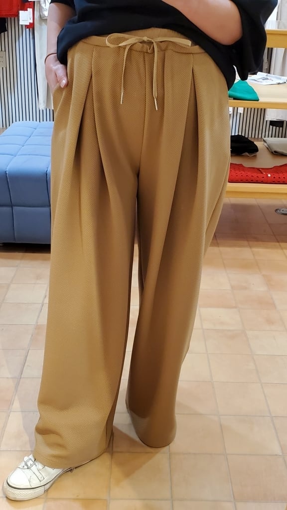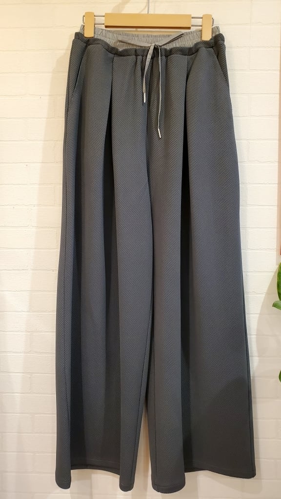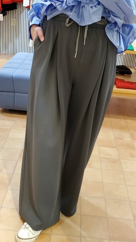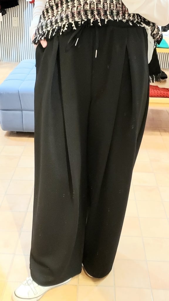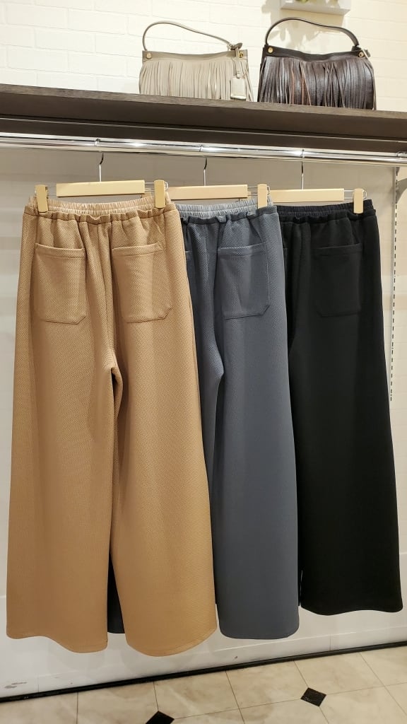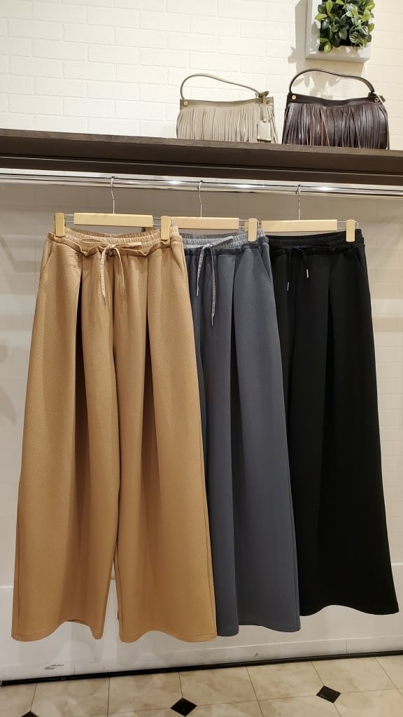 凹凸の表面で、いつもの無地パンツコーディネートに表情を付けて楽しめるこの春イチオシのワイドパンツです!