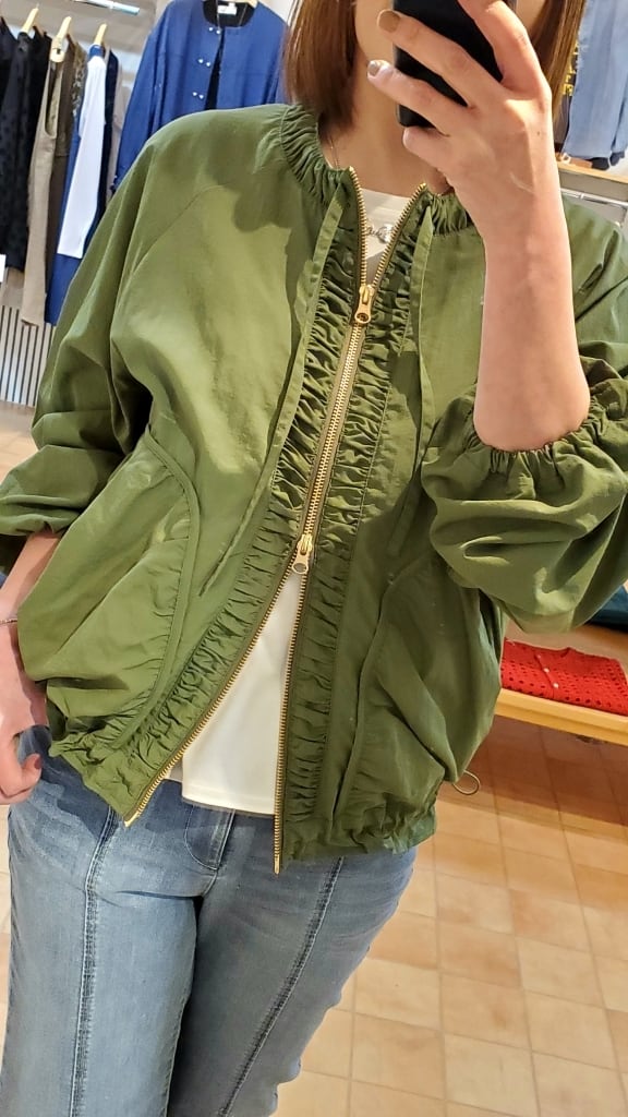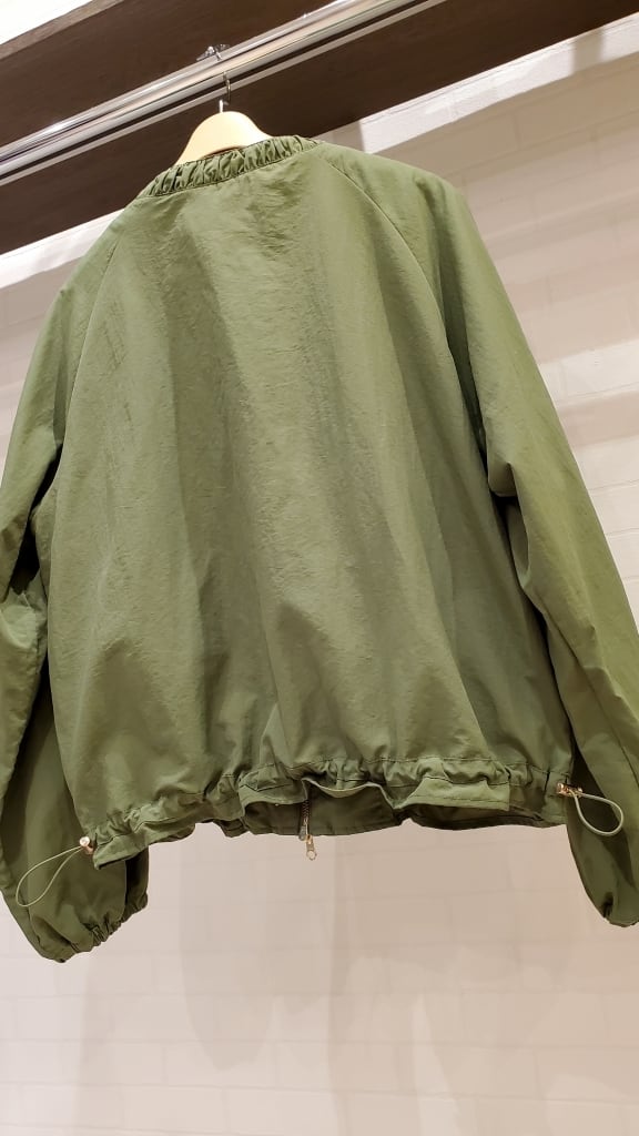 縁取りのギャザーがポイントになるナイロン素材ブルゾンです。
