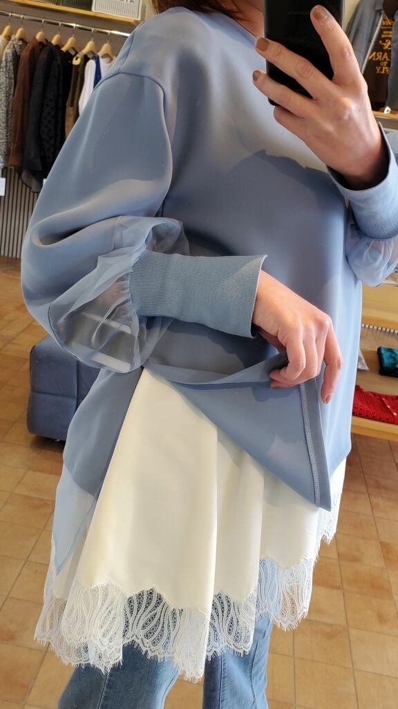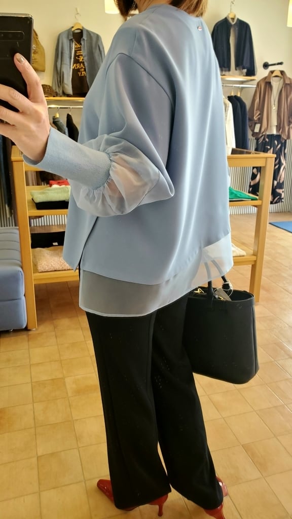 お袖、バックの裾にシアー生地を切り替え、女性らしさと軽やかさが楽しめるデザイン。ふんわりとしたお袖の先はスリット入りのリブ仕様で手首をほっそりと映してくれます◎