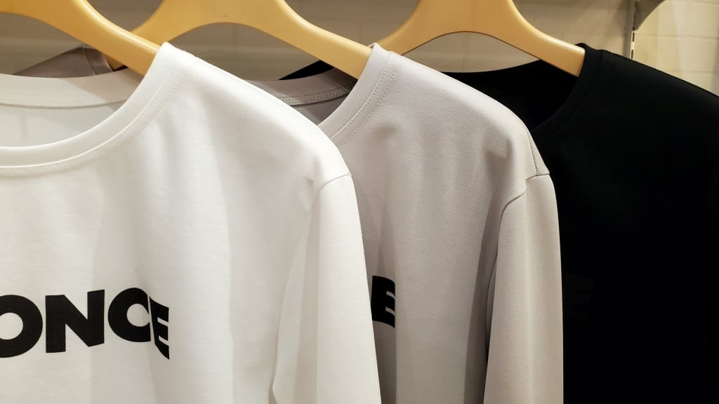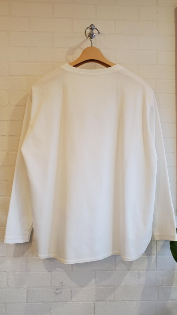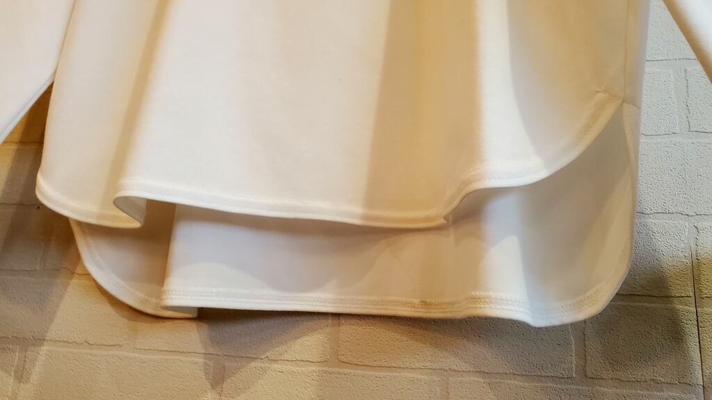 こちらは素材もおすすめ。普通のTシャツ生地よりもしっかりとした質感で、白も透けずに一枚でも安心してご着用いただけます。