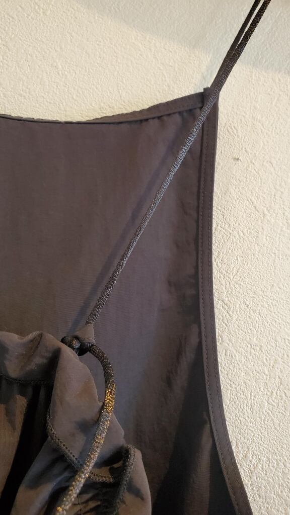 華奢な肩紐は後ろの結びで長さ調節可能。ヒップまでカバーしてくれる丈も嬉しいお作りです◎