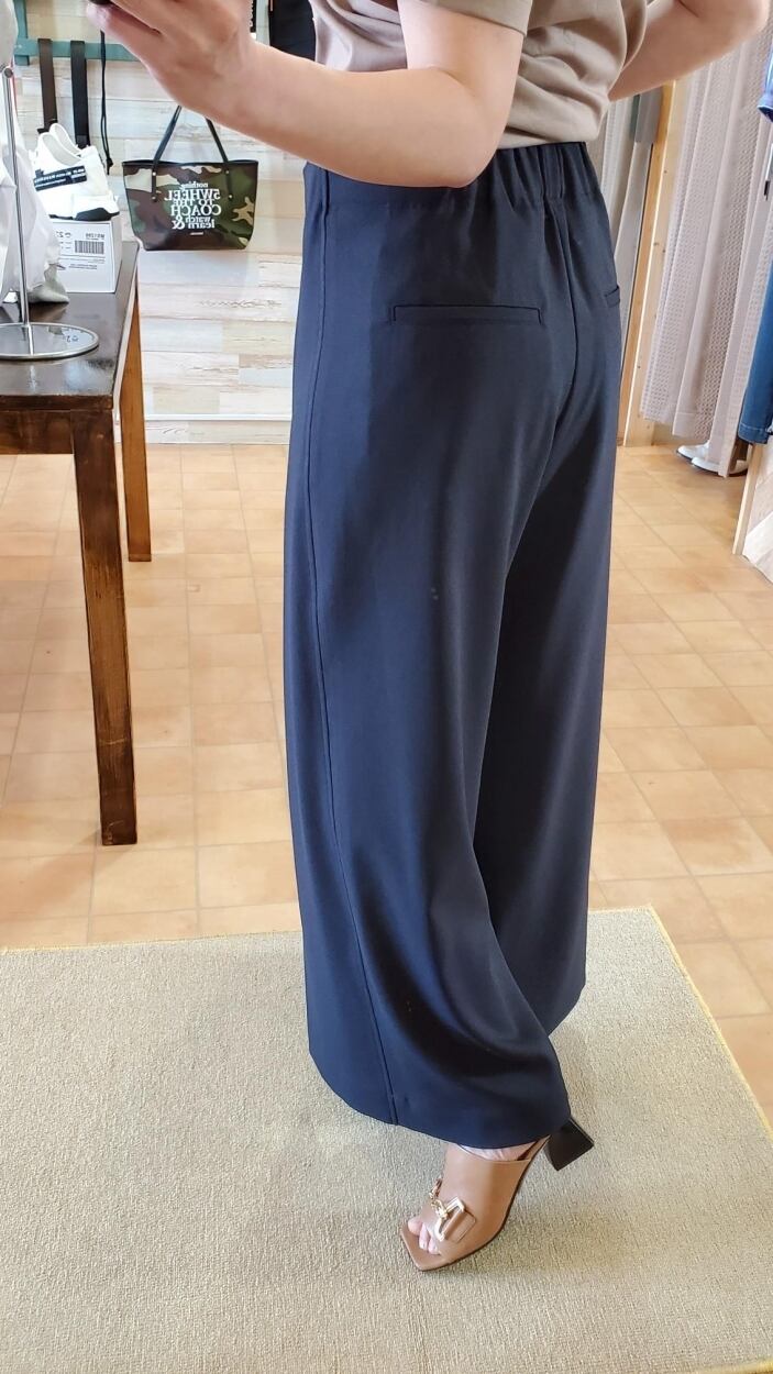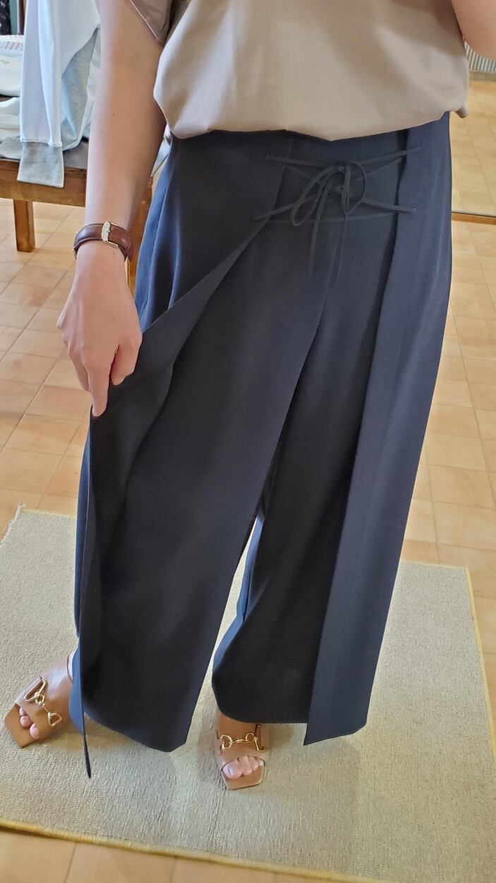 重ね布やウエストの紐レースアップが目を惹き、存在感のあるワイドパンツになっています