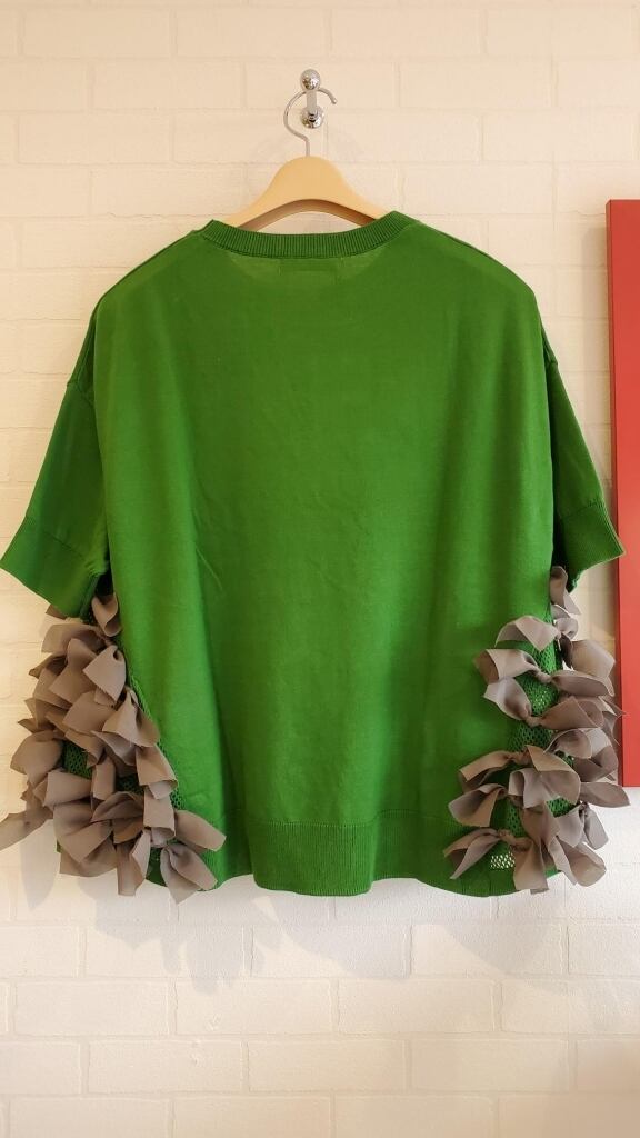 ゆったりとした身頃に両脇リボンを施し、5分のお袖で夏まで着れる涼しい一枚です