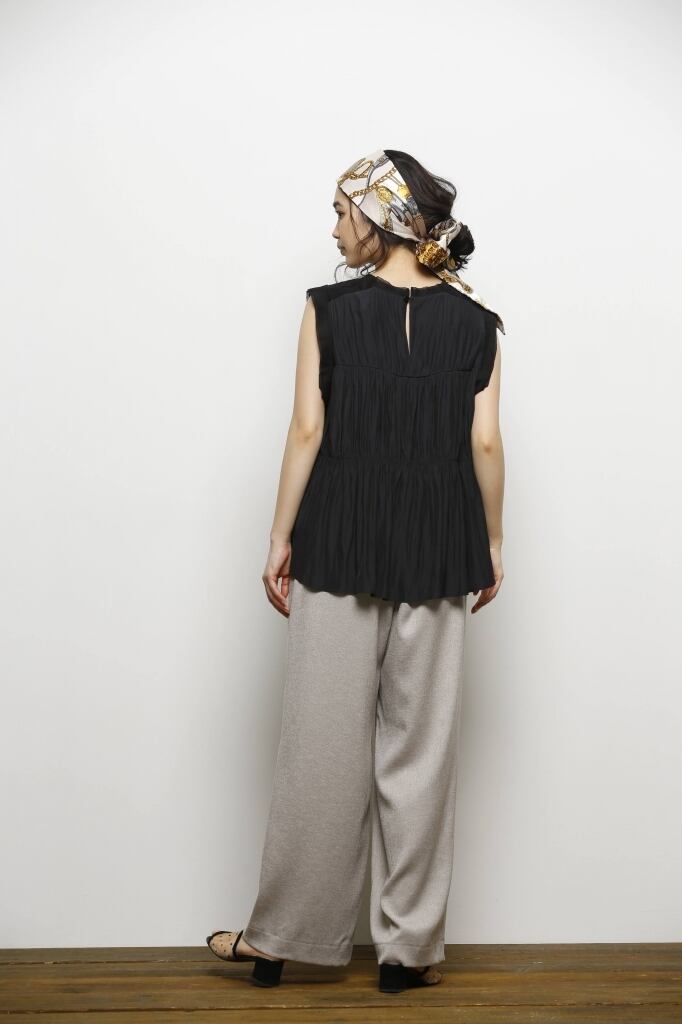 前身にカットジャガード、後身にデシンを切り替えたノースリーブブラウス。