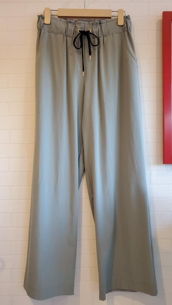 レーヨンメインのつるんとした質感に麻を少しMIXして、涼感たっぷりの肌当たりでお楽しみいただけるワイドパンツです。