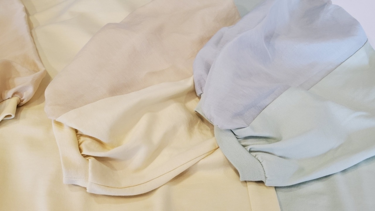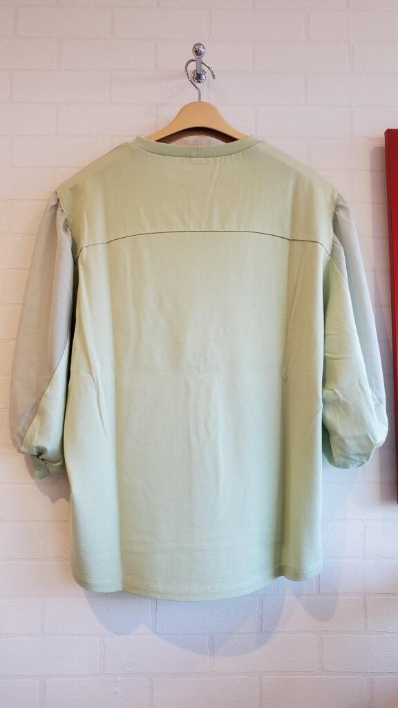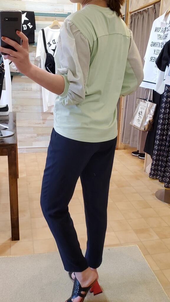 程よい透け感の今年旬のシースルー素材を切り替えた、お袖ふっくら上品カットソー。