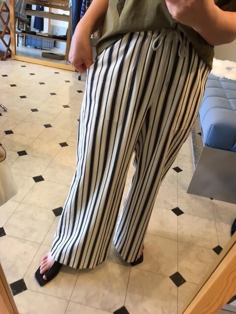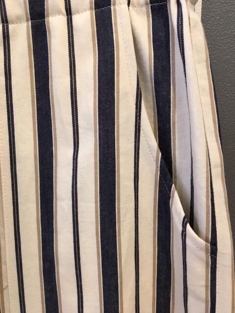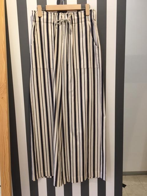 涼感ナチュラル素材のウエストイージーワイドパンツ。ストライプ柄が目を惹きます。